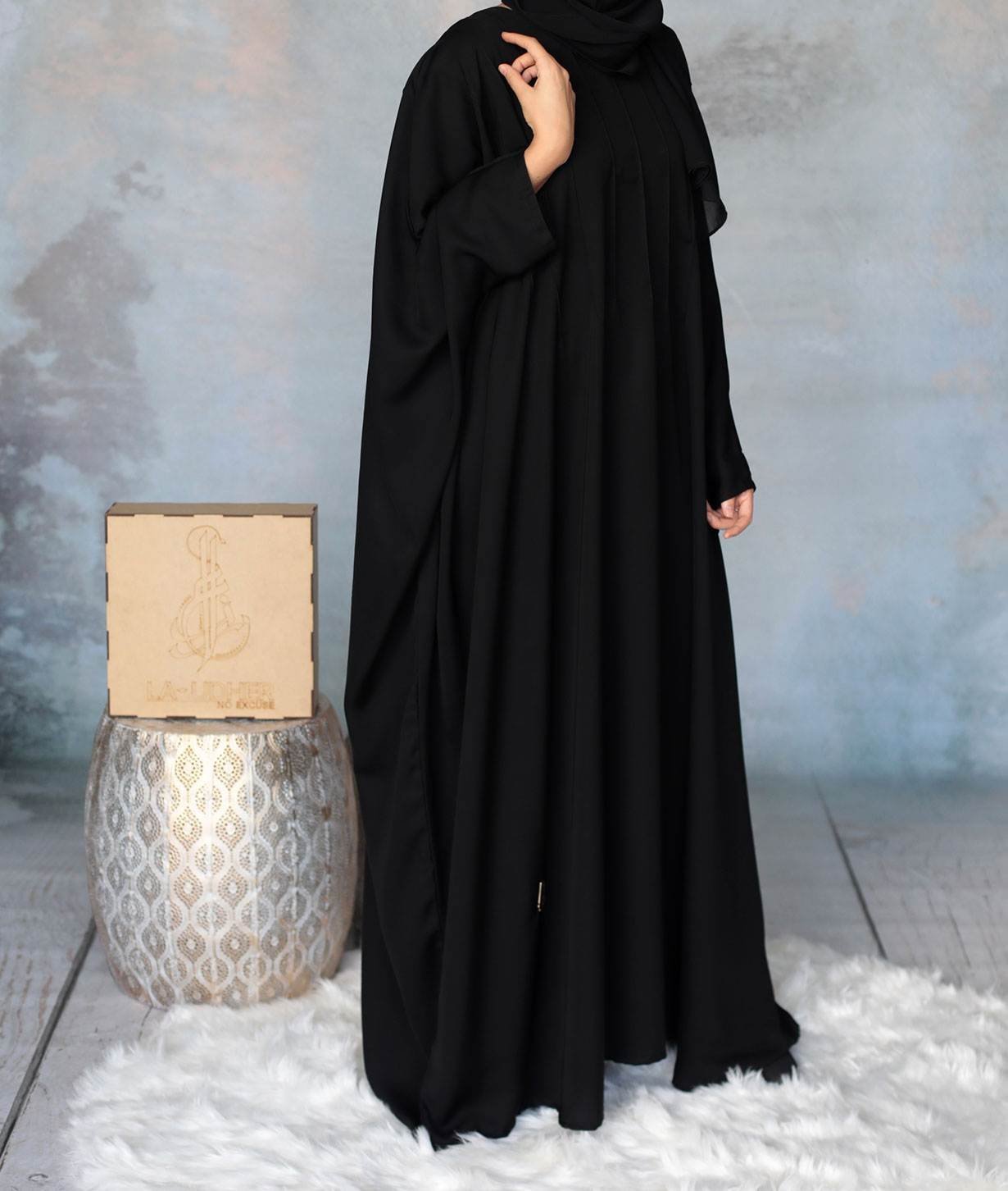 A broad batwing abaya finished with pleats running across the top bodice for a simple, yet elegant look.
