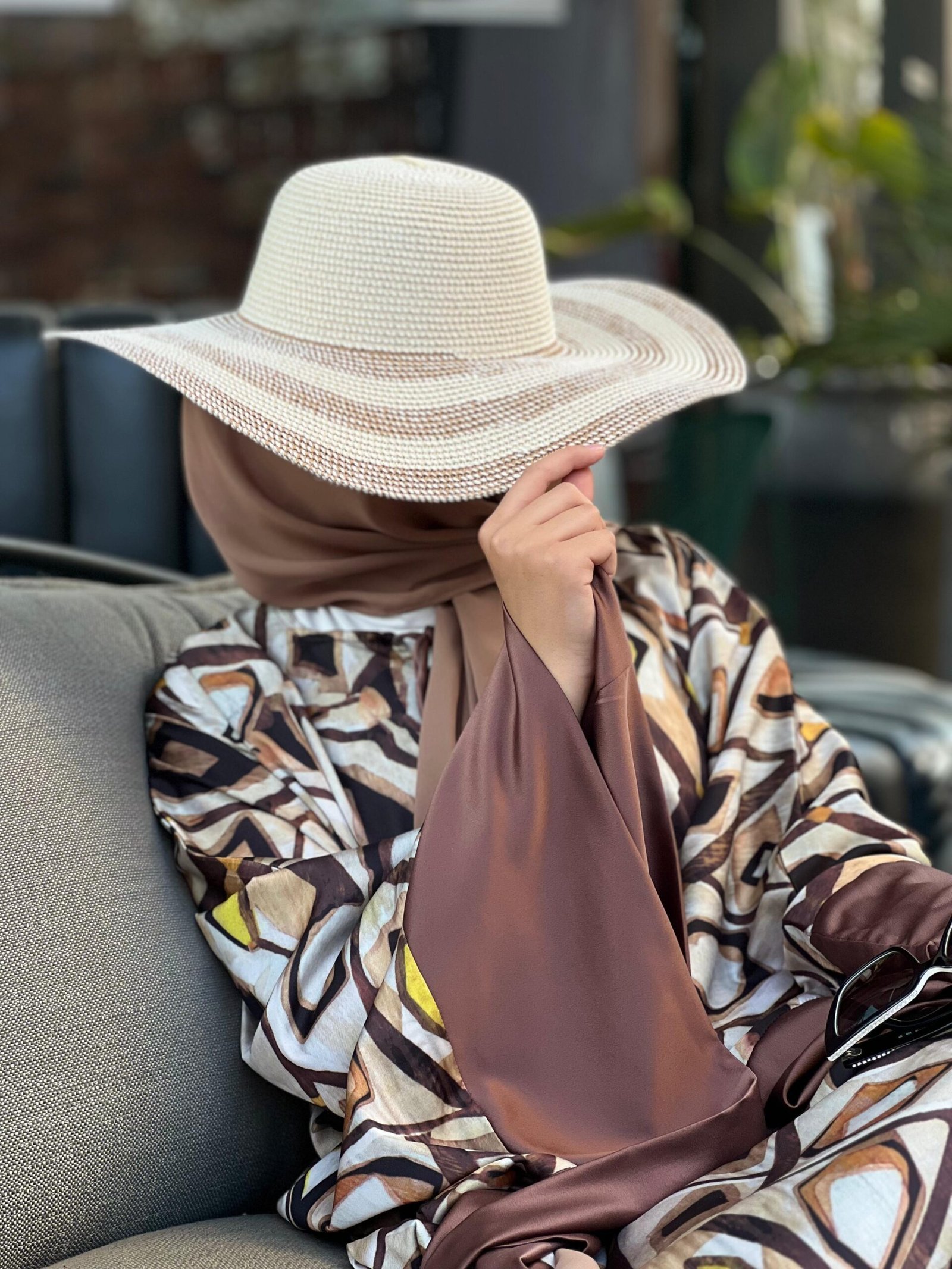 With bold geometric patterns in earthy tones and golden highlights, this kaftan captures light in every angle.