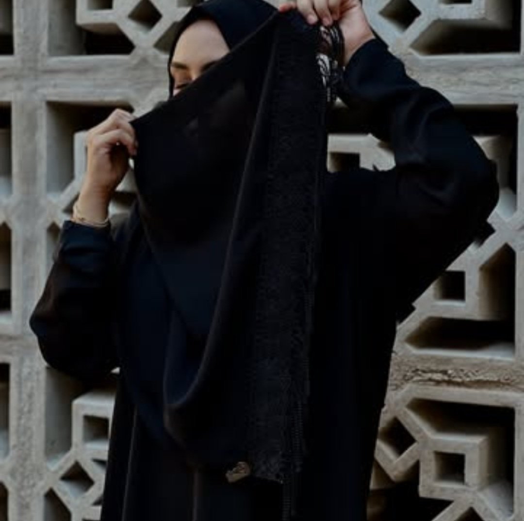 This black abaya features a loose, flowing silhouette with an elegant fringe and lace detailing at the lower part. Its minimalist design is complemented by a matching black hijab, creating a sophisticated and timeless look.
