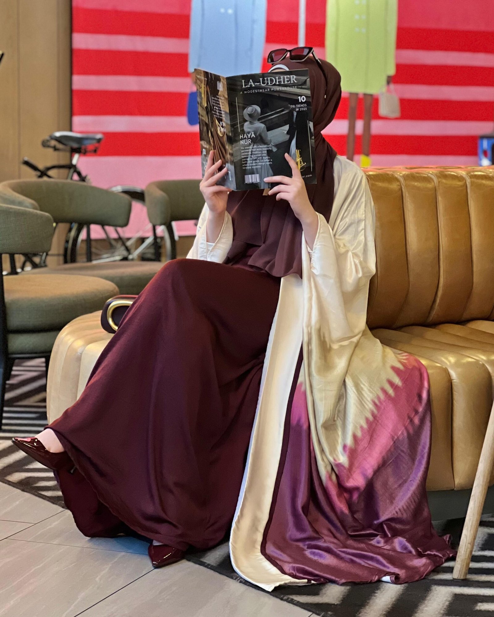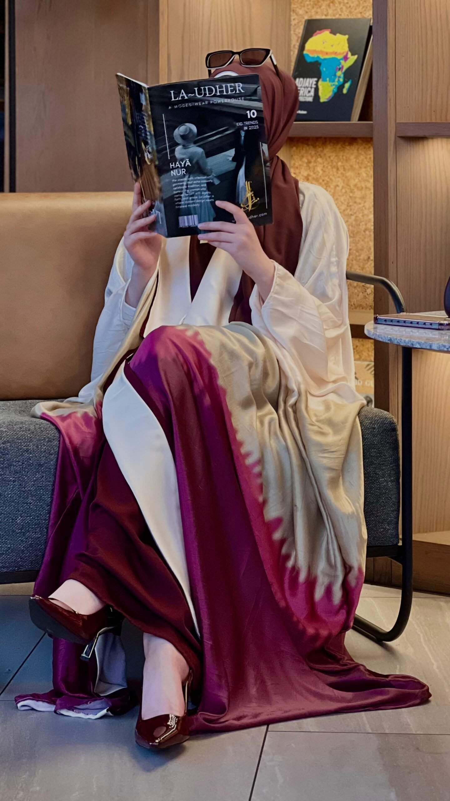 A kaftan that flows with ease — deep burgundy softened by ivory and a blush ombré detail. Gentle yet powerful, it