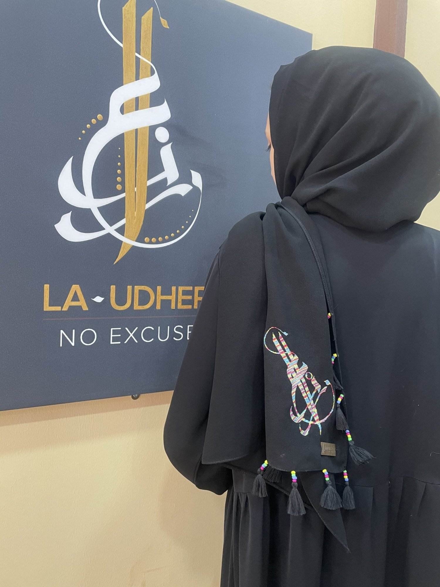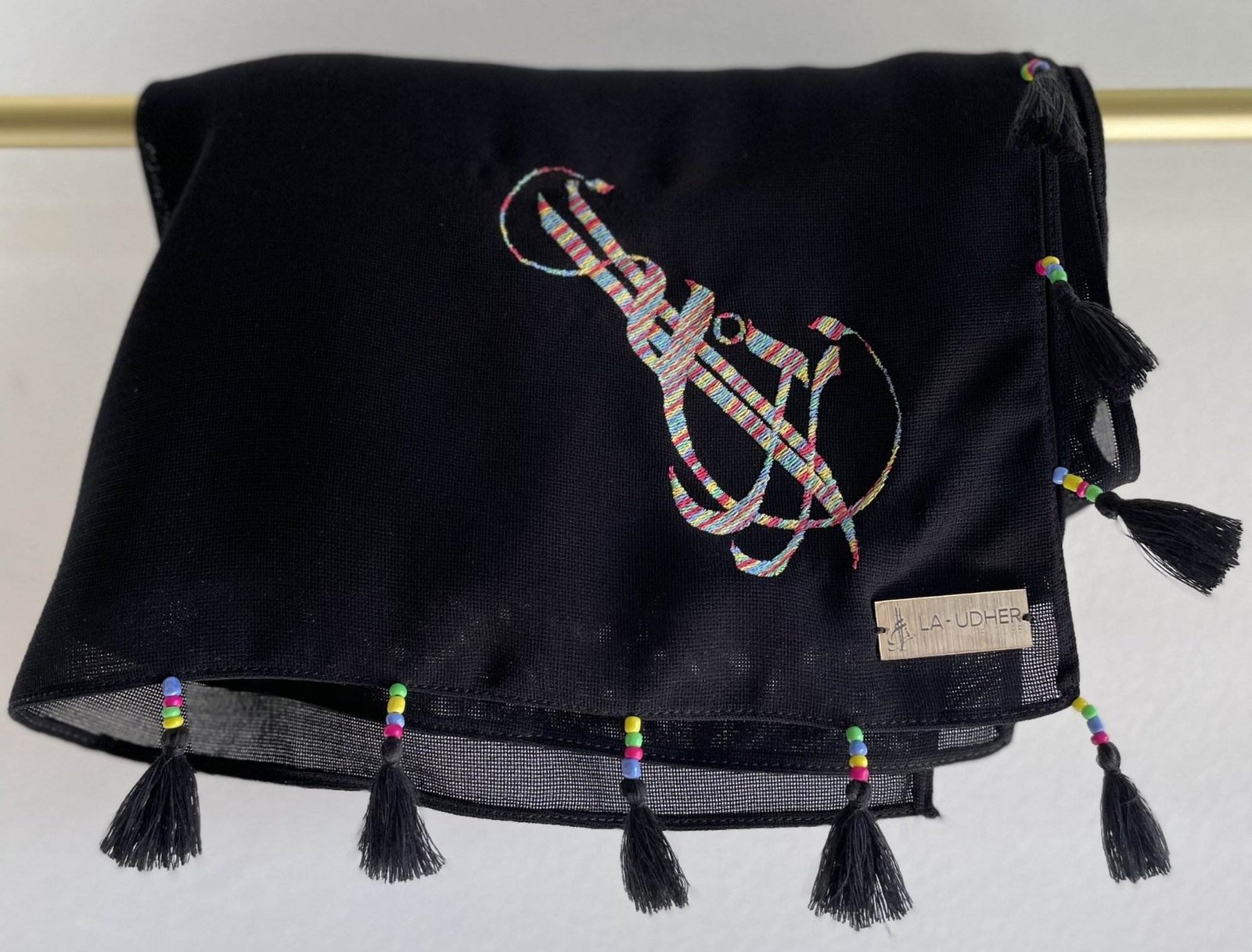 Bright and bold, La-Udher’s multi colored embroidered logo on the finest riya linen.