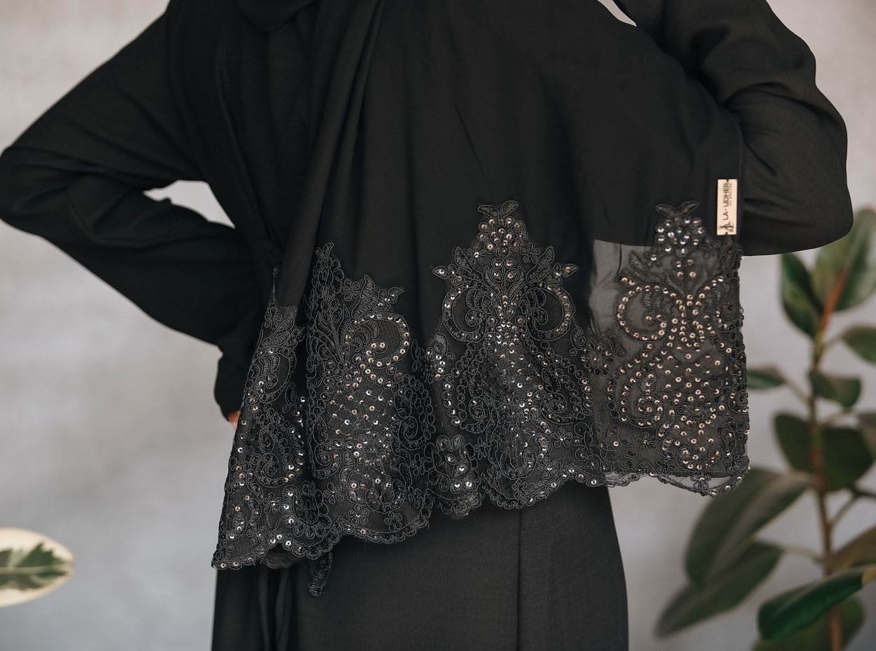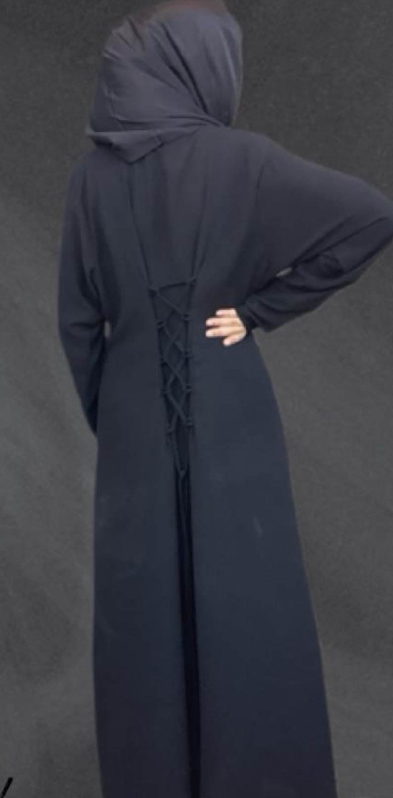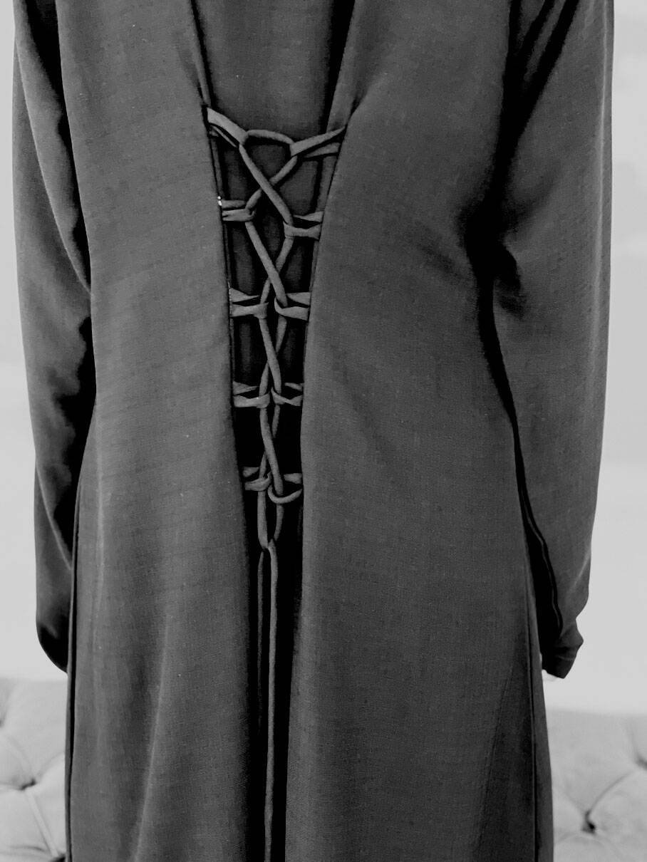 Beautiful soft Riya Linen abaya detailed in a crisscross tie back that can be adjusted for elegance and suitability to your fit.