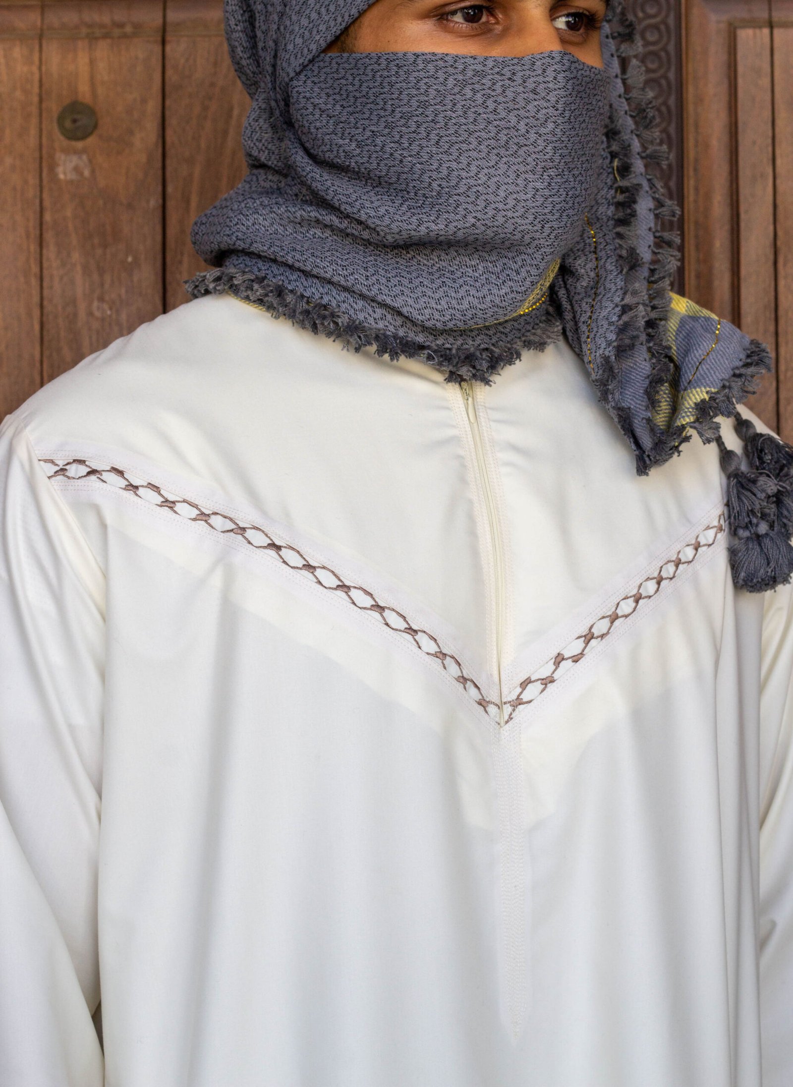 Introducing the Ruhani thobe, where elegance meets symbolism. With a hidden keffiyah print between panels, it honours Palestine’s connection to the mediterranean sea and the resilience of its people.