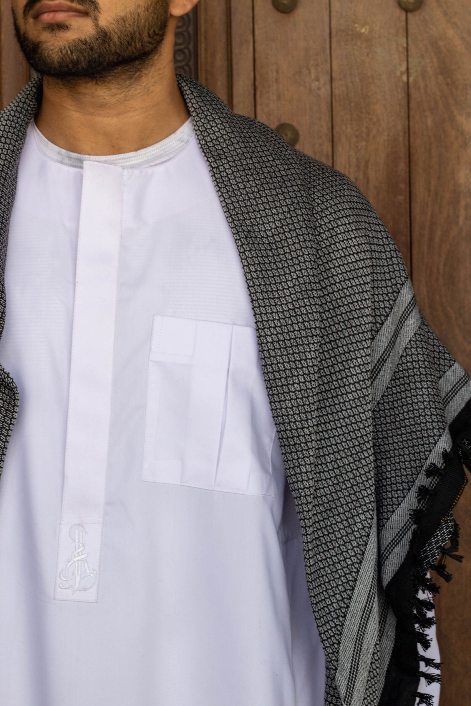 Introducing the Ruhani thobe, where elegance meets symbolism. With a hidden keffiyah print between panels, it honours Palestine’s connection to the mediterranean sea and the resilience of its people.