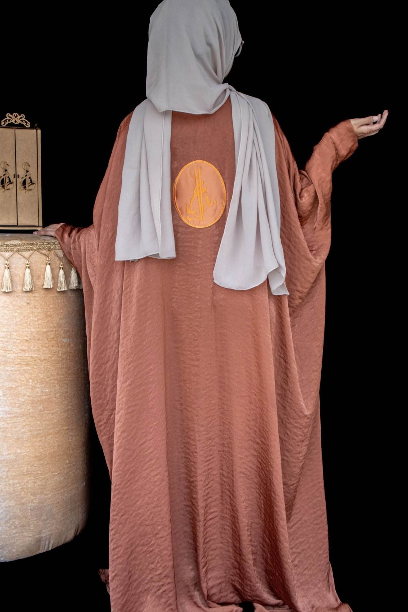 This copper-coloured Emarati abaya boasts a graceful silhouette and is adorned with the iconic La-Udher logo on the back, merging timeless elegance with contemporary style.