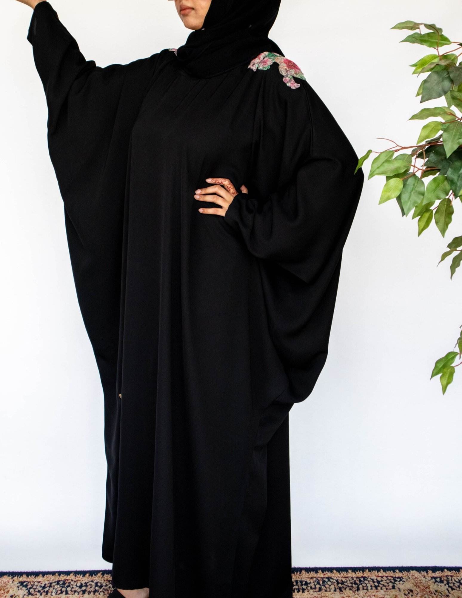 Discover elegance redefined in this abaya featuring a charming flower motif delicately embroidered on the shoulder, accompanied by a matching scarf.