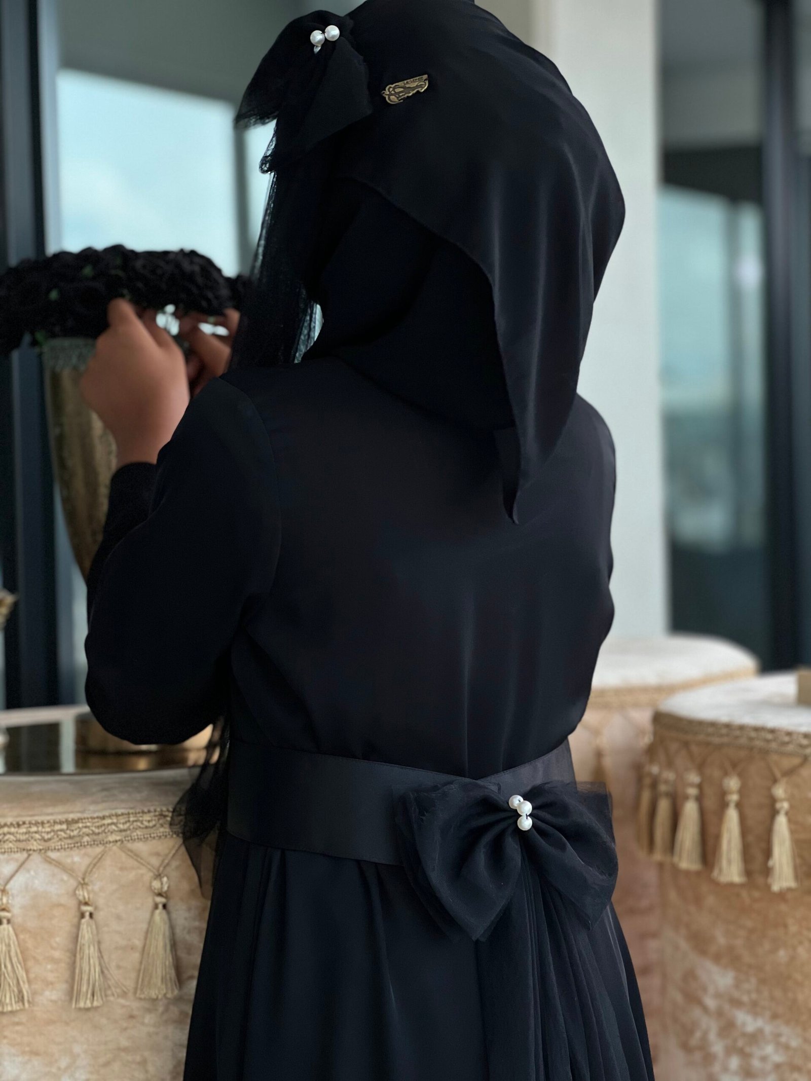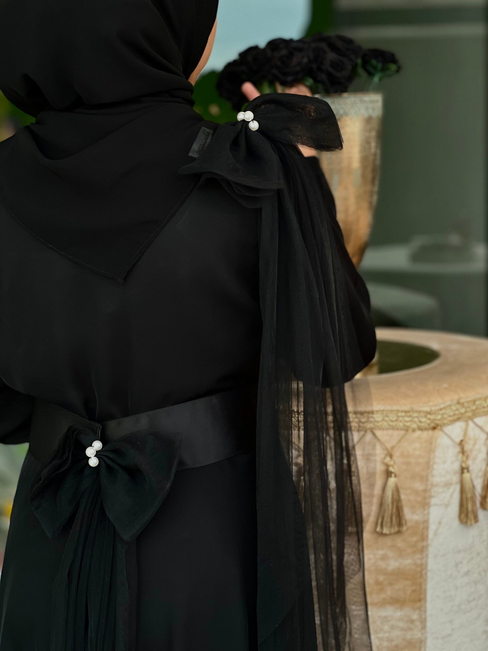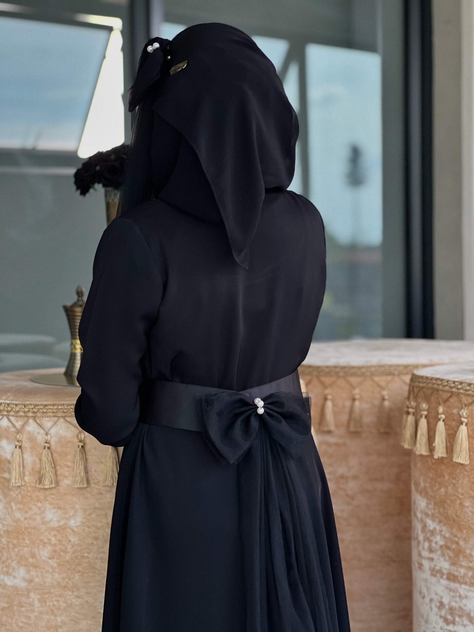 This adorable abaya this adorable abaya is the perfect mix of cute and charming! With a sweet belt featuring a bow net piece adorned with pearls for that extra sparkle, it’s the definition of cuteness. The matching bow on the hijab adds an extra touch of whimsy. Also Detachable.