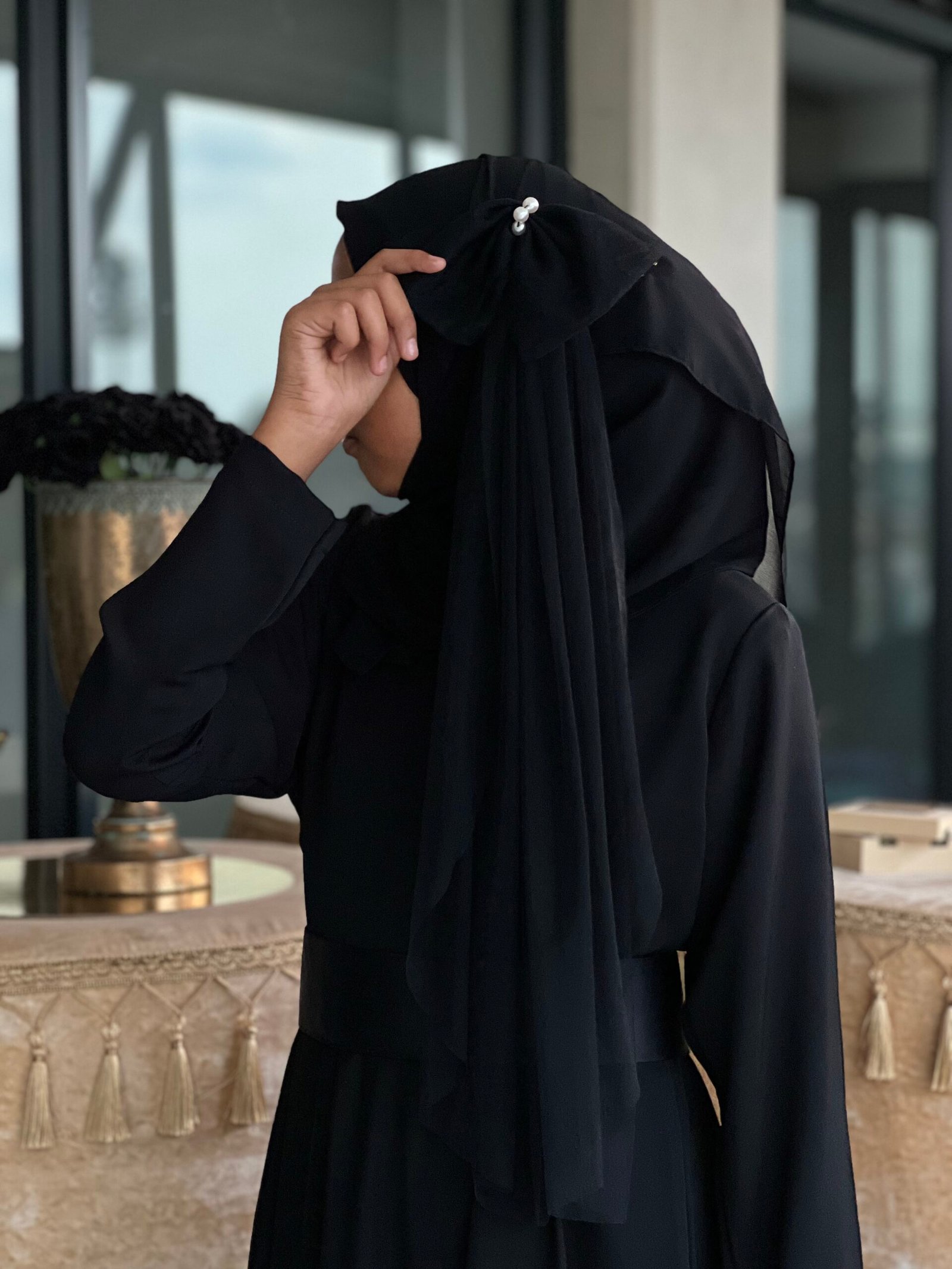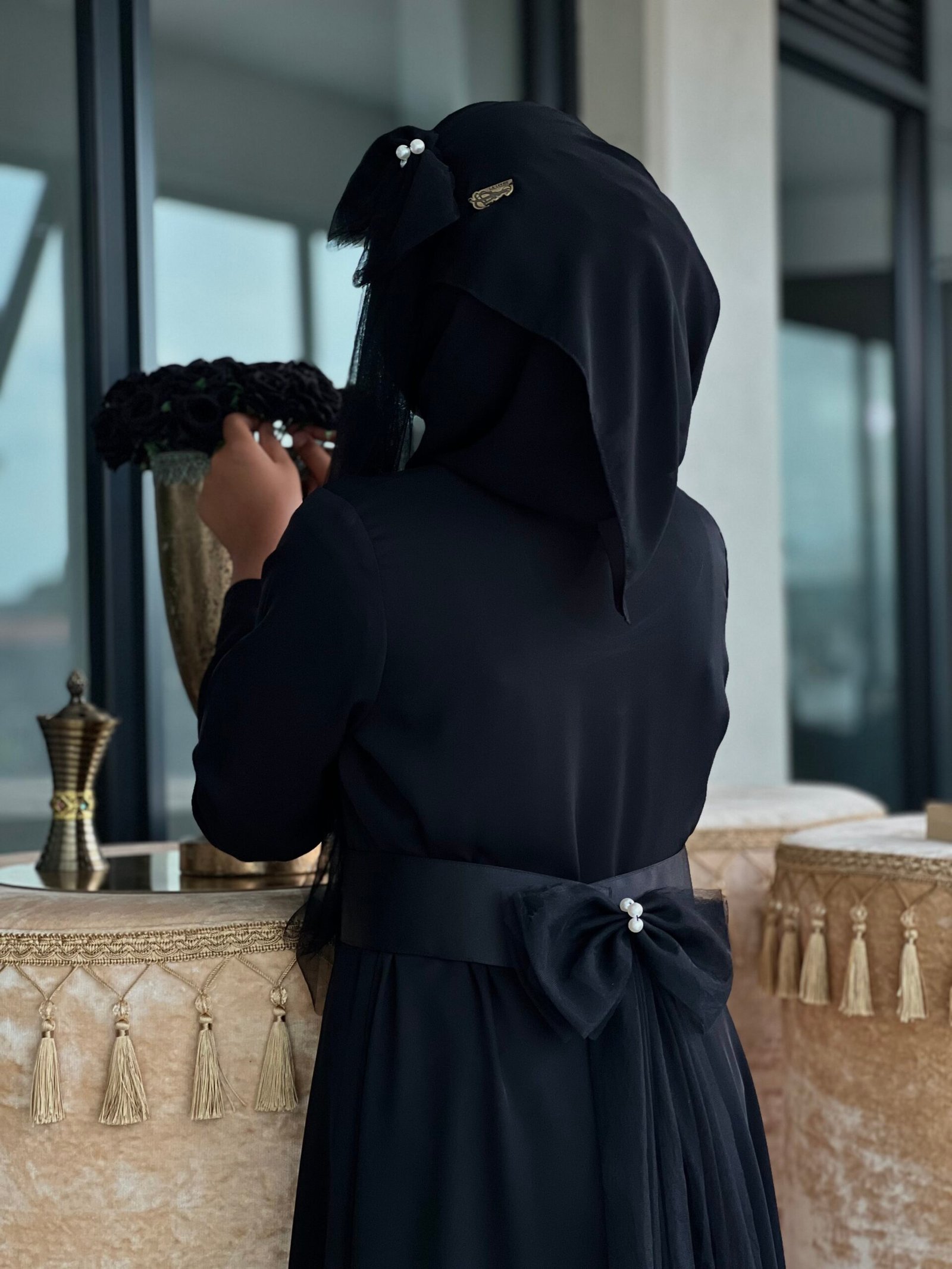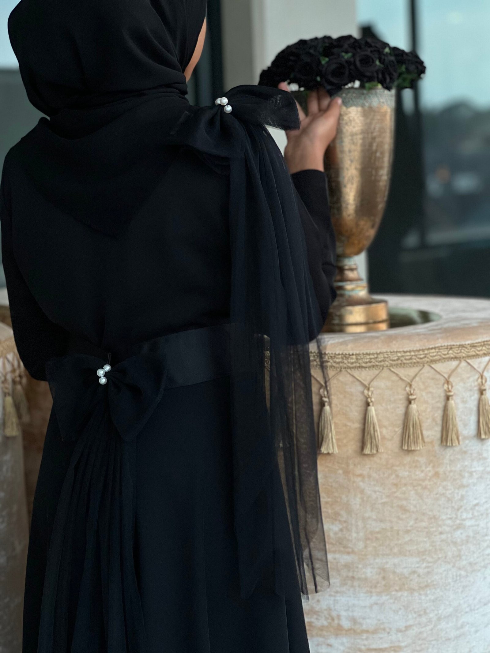 This adorable abaya this adorable abaya is the perfect mix of cute and charming! With a sweet belt featuring a bow net piece adorned with pearls for that extra sparkle, it’s the definition of cuteness. The matching bow on the hijab adds an extra touch of whimsy. Also Detachable.