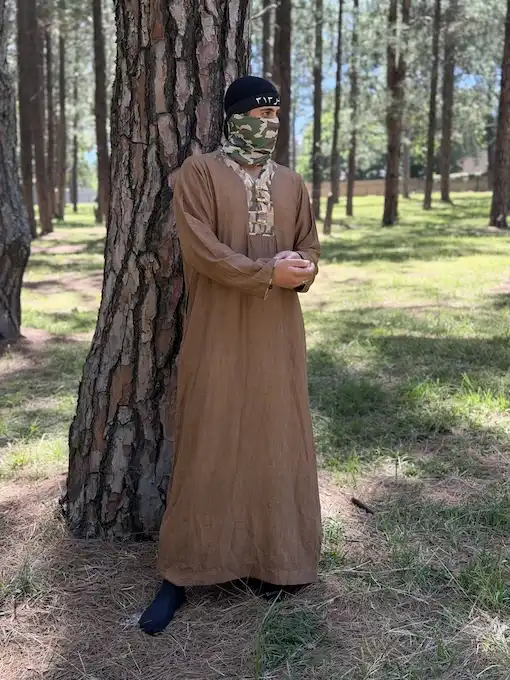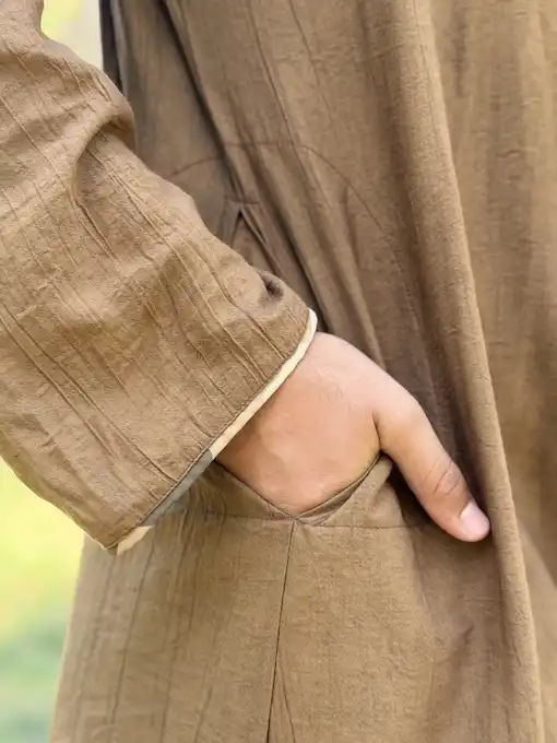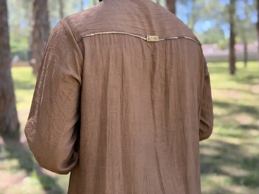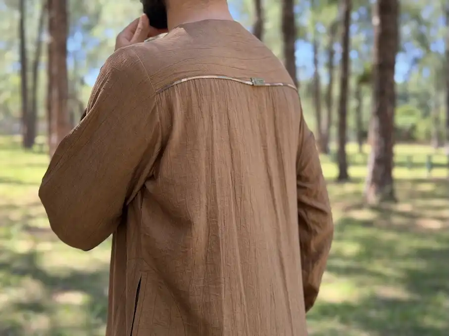 Al-Qā’id embodies command and silent authority. Crafted from premium textured fabric in a rich cocoa tone, the design is distinguished by its camouflage inner panel with wooden toggle closures — merging natural elements with warrior symbolism The relaxed drape ensures comfort while preserving a noble structured front. Standard fit — fully customisable
