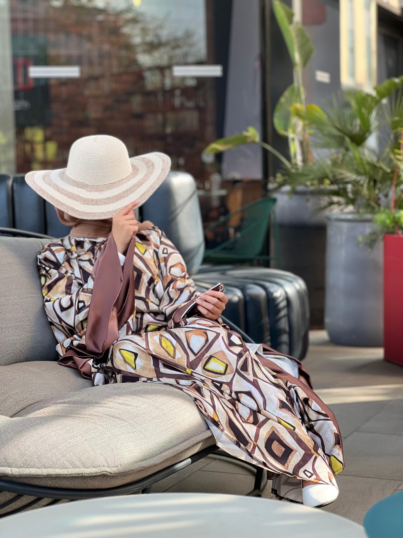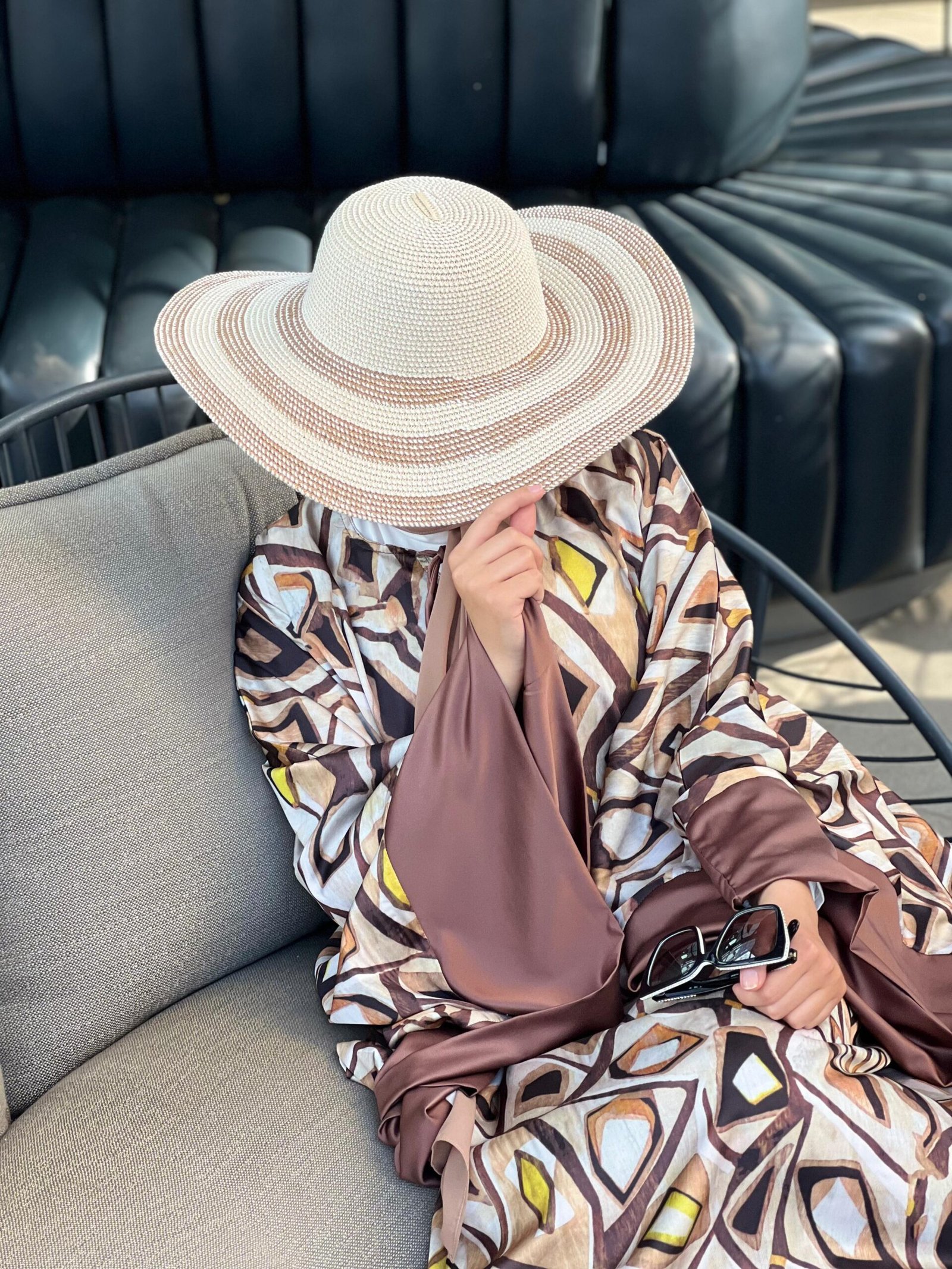 With bold geometric patterns in earthy tones and golden highlights, this kaftan captures light in every angle.