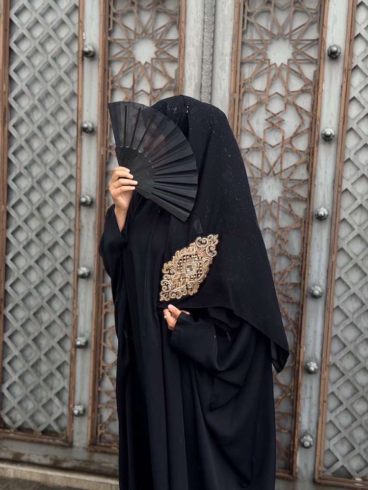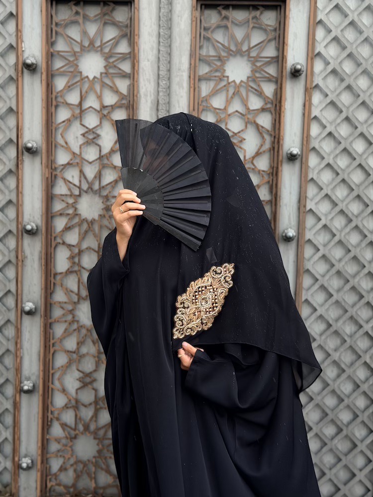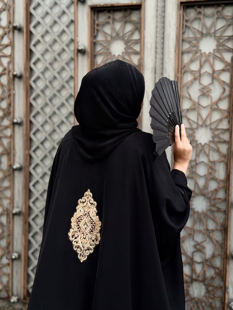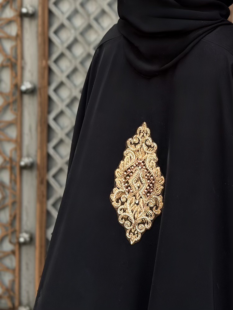 A-black drape with a flowy silhouette, finished with an ornate gold motif detail that subtly commands attention.