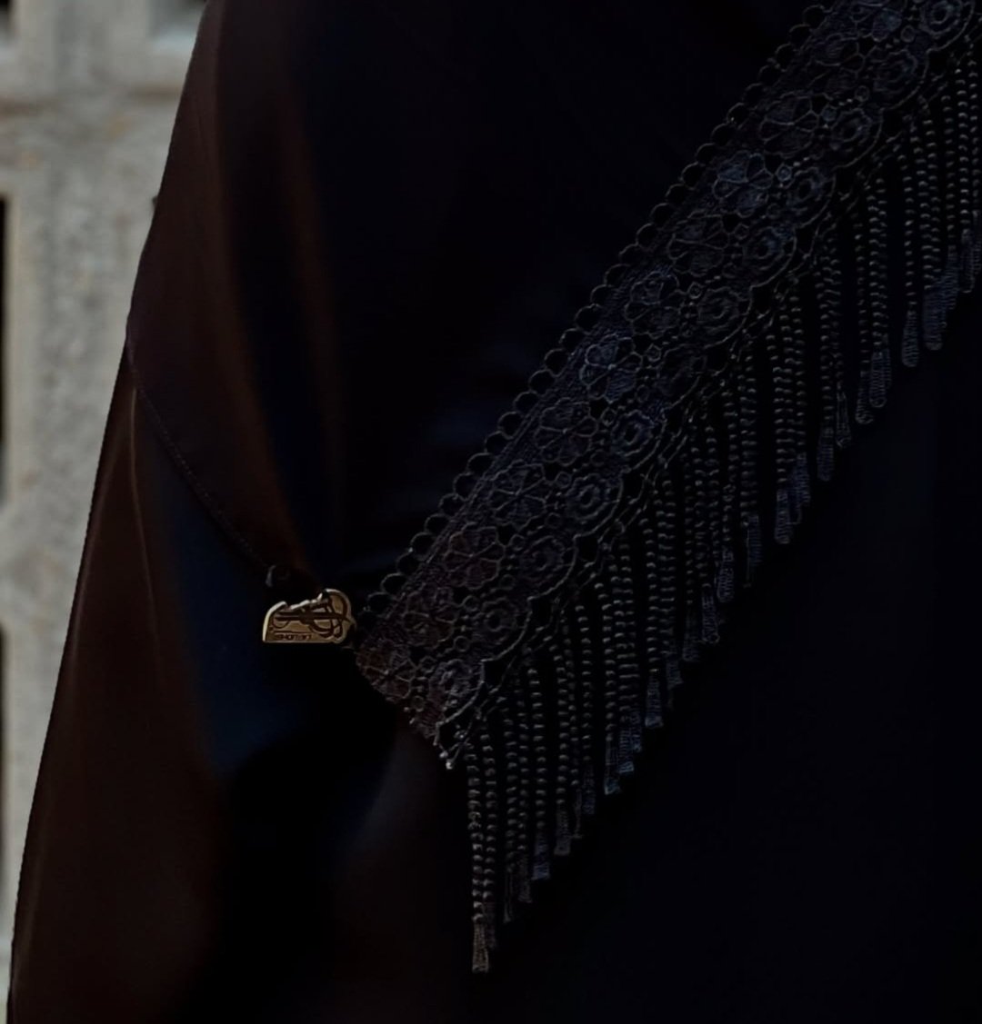 This black abaya features a loose, flowing silhouette with an elegant fringe and lace detailing at the lower part. Its minimalist design is complemented by a matching black hijab, creating a sophisticated and timeless look.