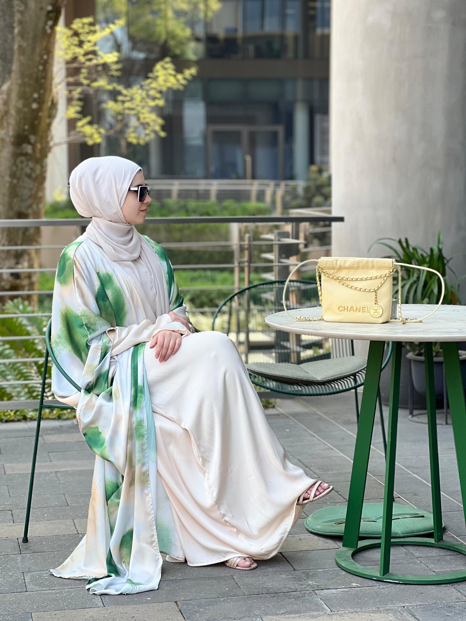 A serene blend of ivory and green brushstrokes,flowing with tranquil grace and evoking a garden in paradise. The soft ivory inner dress is also available for purchase separately — a versatile piece of elegance on its own.
