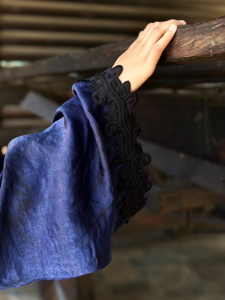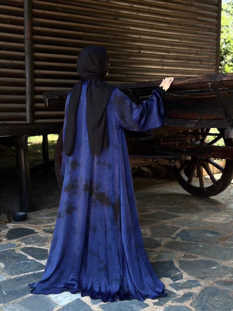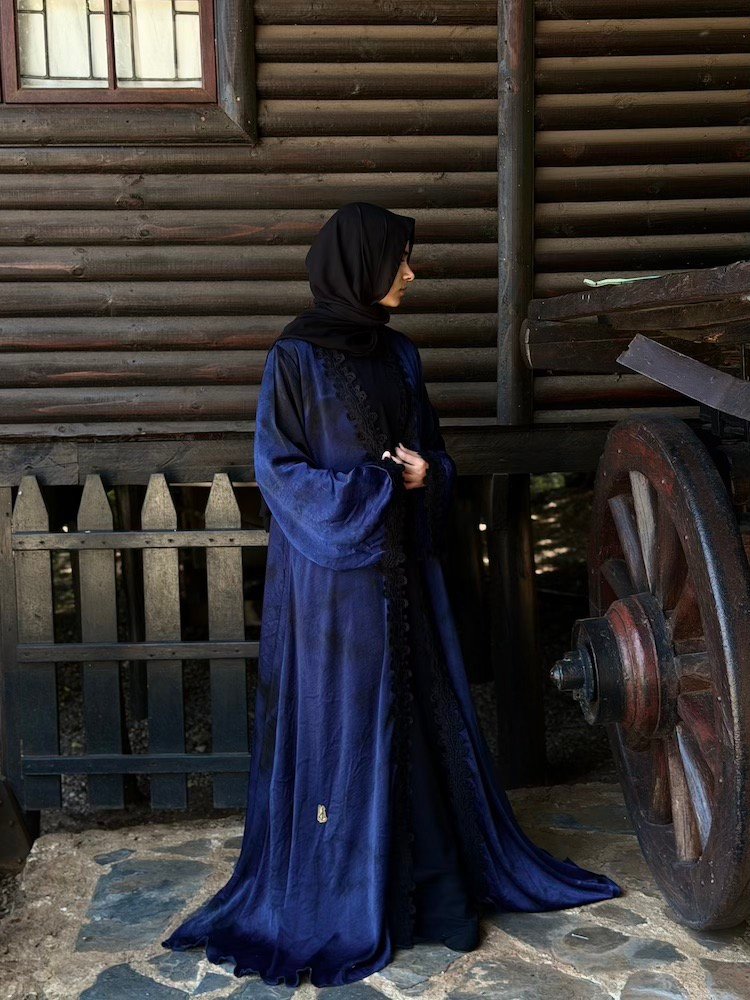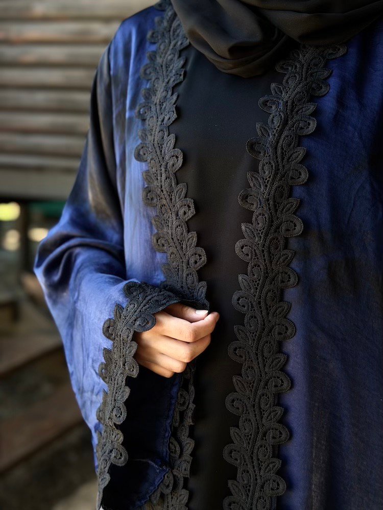 A deep navy open abaya finished with tonal black embroidery along the front opening and cuffs. The embroidery is subtle yet dimensional — adding texture without overpowering the garment. Tailored shoulders with relaxed sleeves create a balanced silhouette.