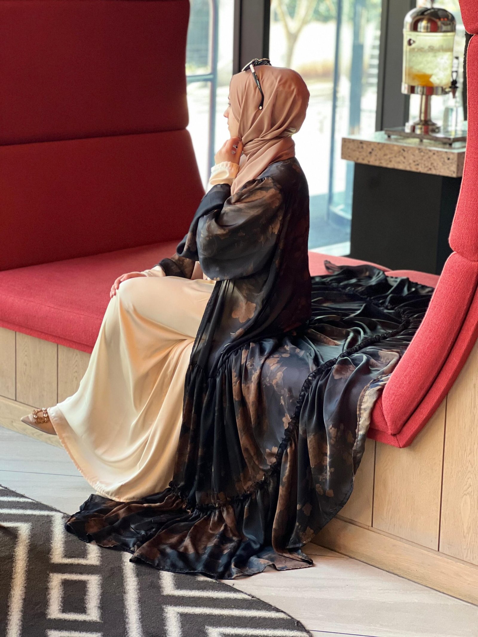 A deep, ethereal kaftan in dark earthy tones with a soft, flowing finish. Its subtle sheen and graceful drape create an elevated presence —modest yet majestic, angelic in poise and refinement.