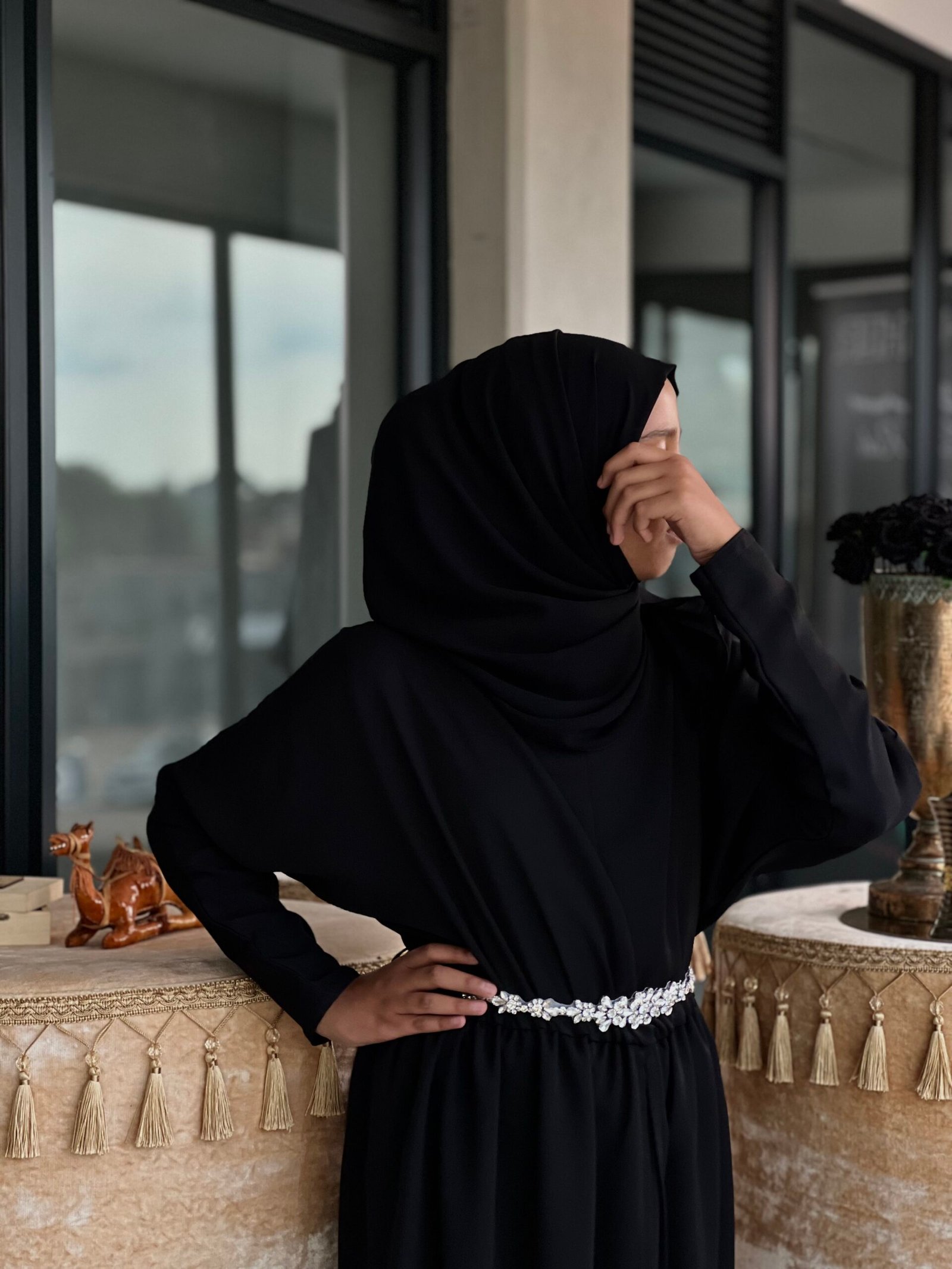 This simple and comfy kid’s abaya is perfect for everyday elegance. Featuring a silver chain belt that adds a touch of sparkle, it combines effortless style with comfort, making it ideal for little ones who love a sleek, easy-to-wear look.
