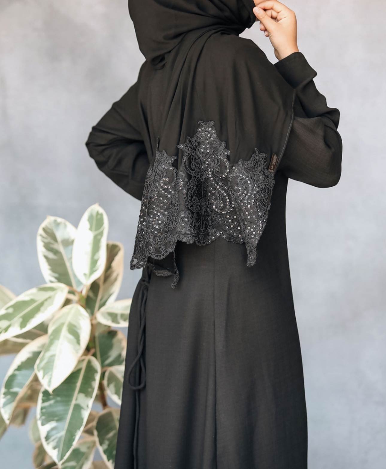 Beautiful soft Riya Linen abaya detailed in a crisscross tie back that can be adjusted for elegance and suitability to your fit.