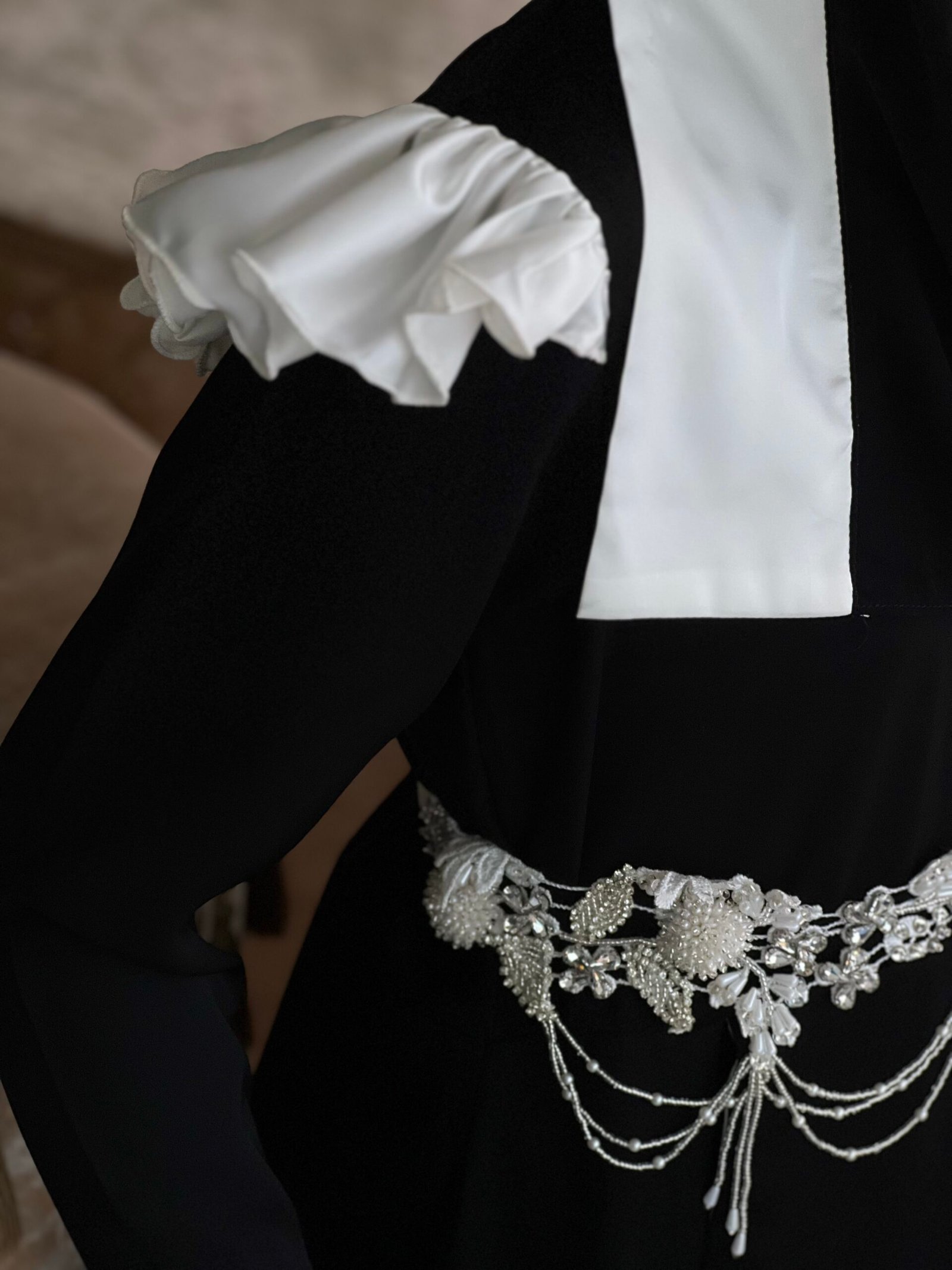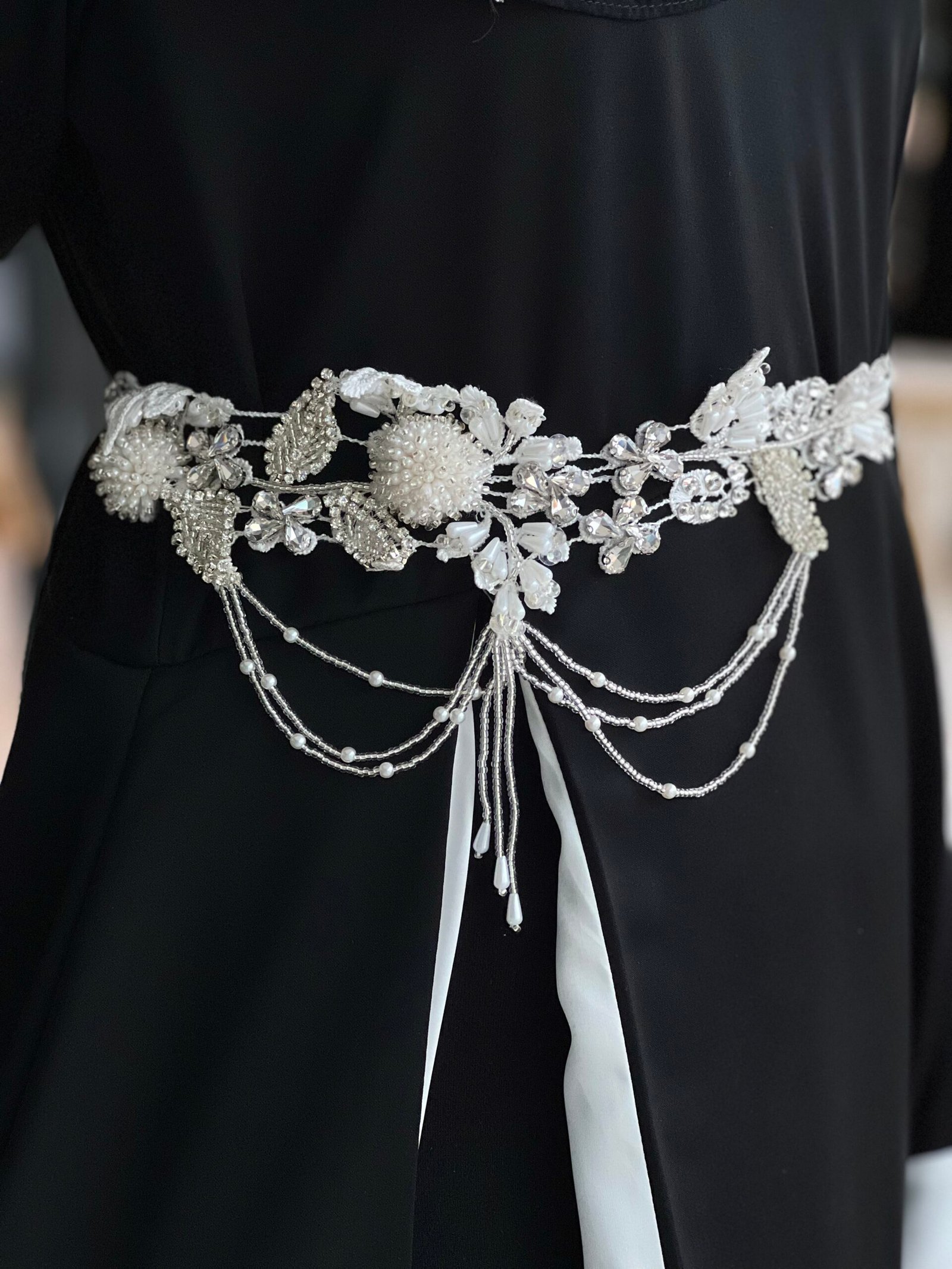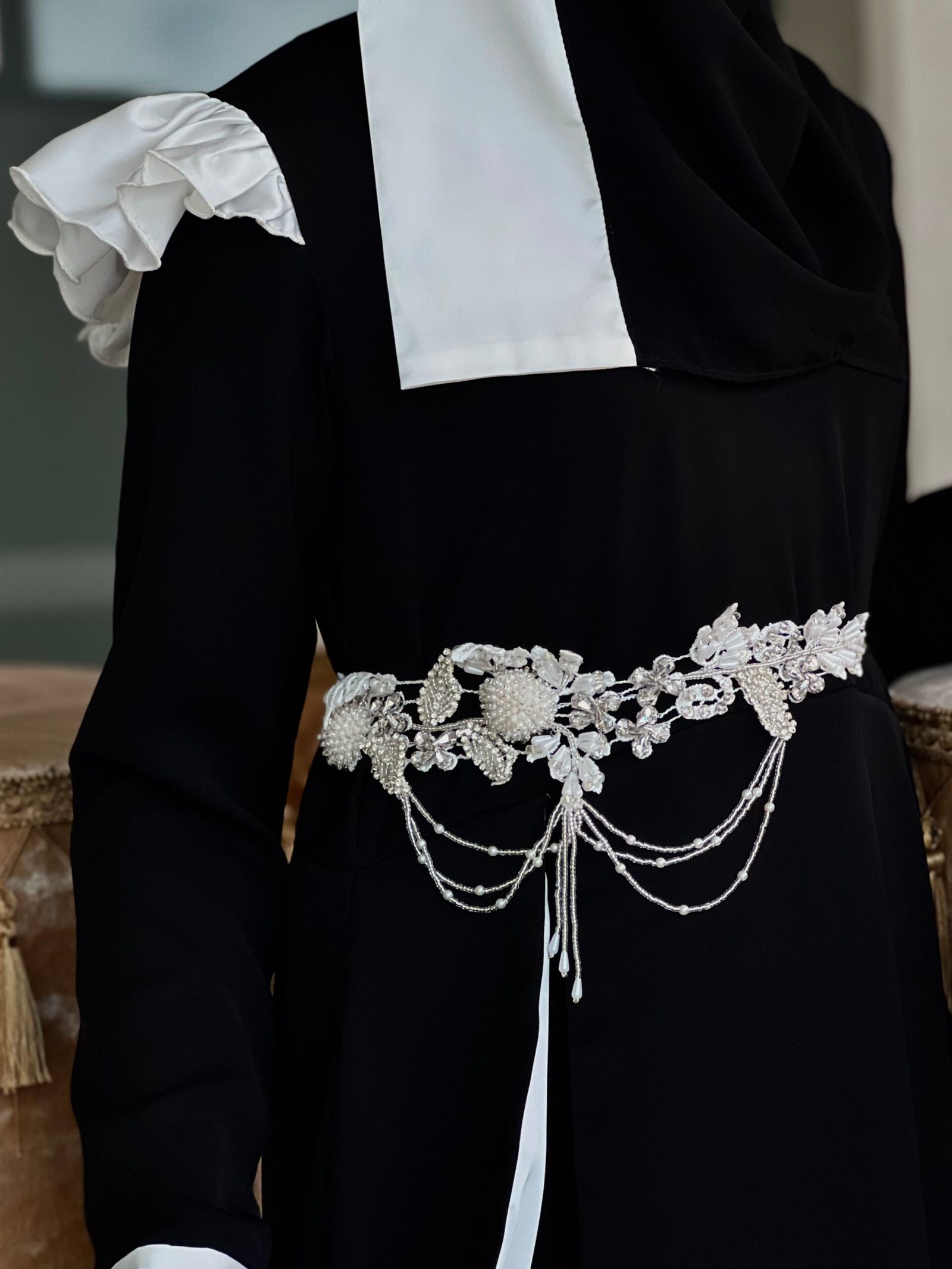 A stunning blend of elegance and grace, this kid’s abaya features sleek white accents, a delicate silver waist chain, and a chic slit for layering with tights. A shimmering masterpiece for little ones who love sophistication with a touch of magic!