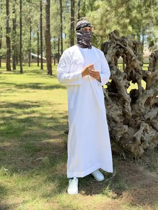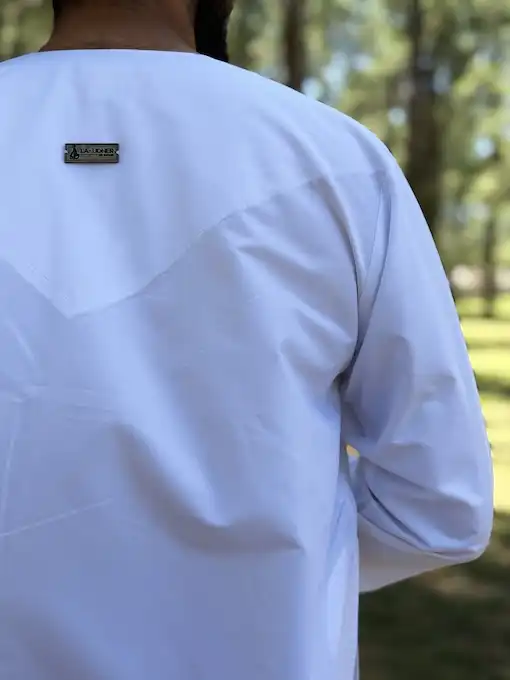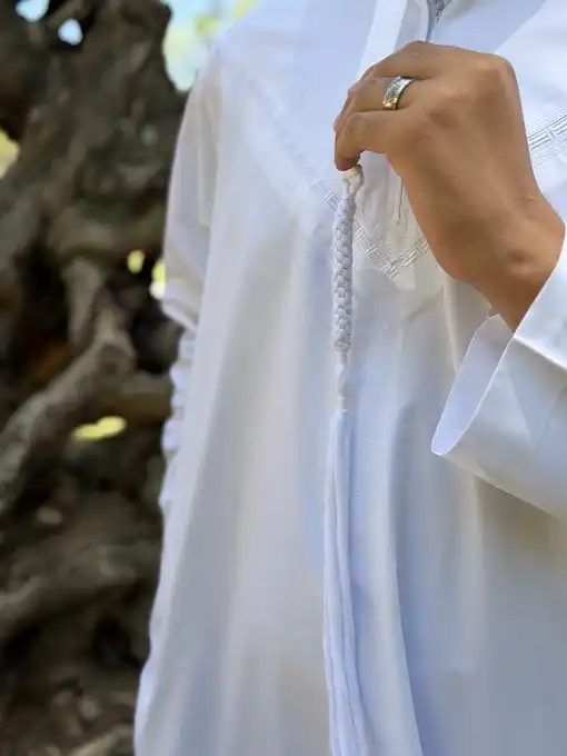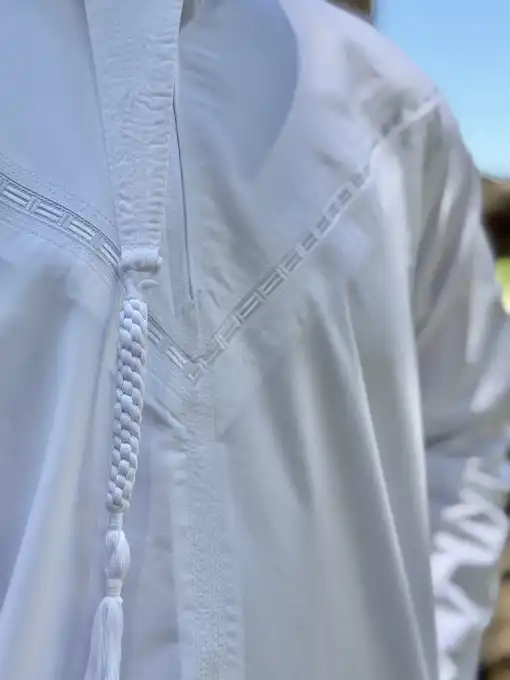 Nūr al-Nasr represents divine aid and purity granted on the day of Badr. Tailored from premium fabric with a smooth luminous finish, the piece features fine tonal embroidery across the chest panel with a hand-braided tassel closure. Its clean white silhoeuette radiates serenity, dignity, and spiritual elevation Designed in a standard modest fit with customisable length and sizing options