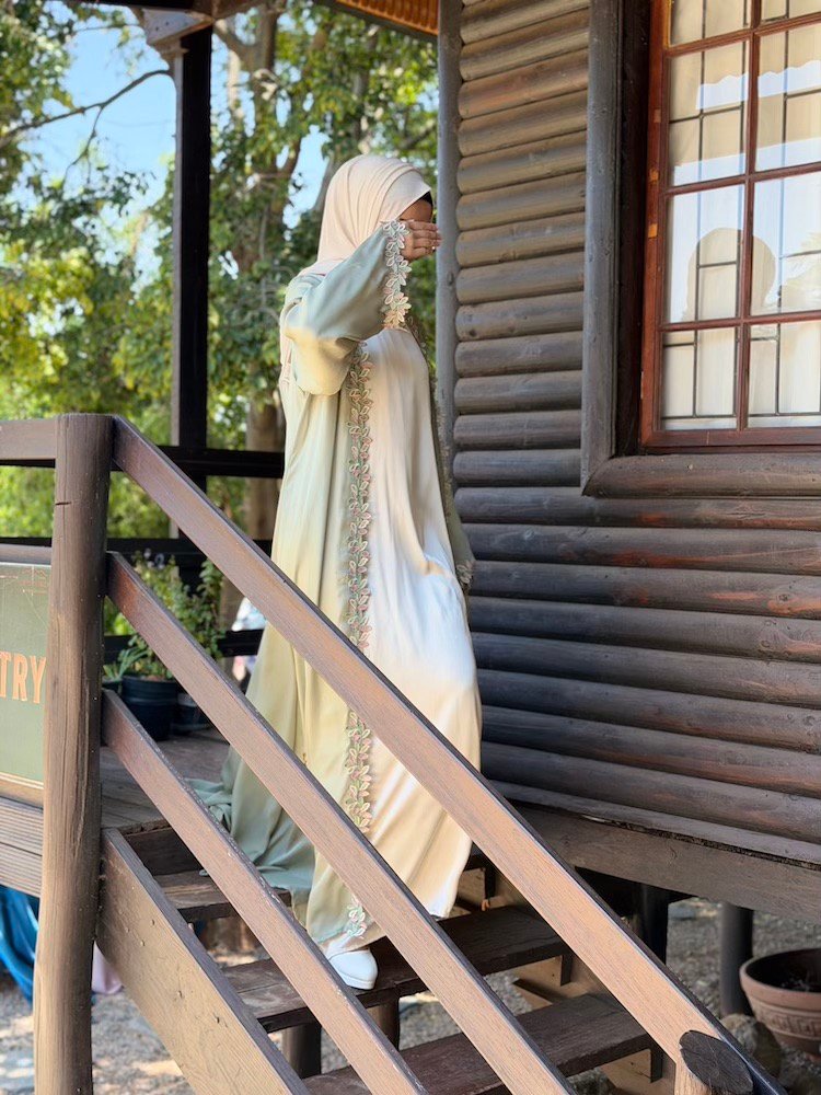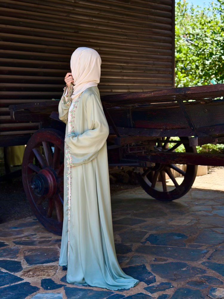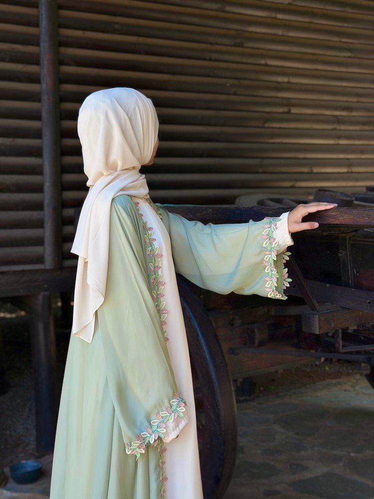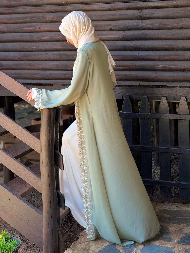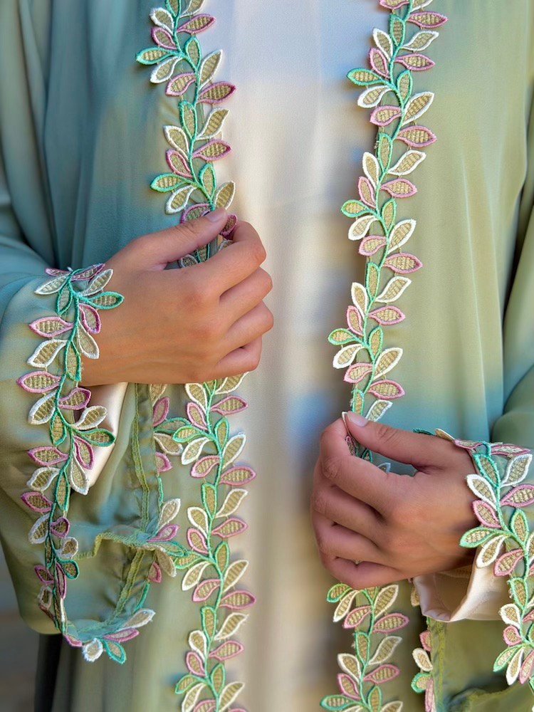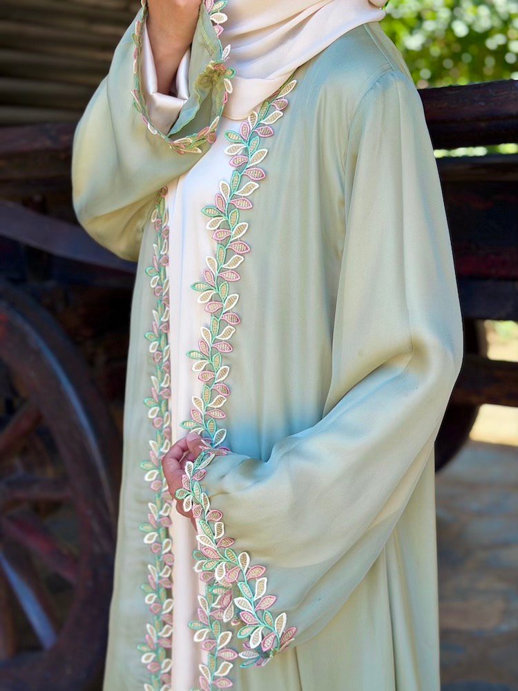 A soft sage-green abaya elevated with pastel botanical embroidery running along the front panels and sleeve edges. The embroidery blends blush, mint, and ivory tones — creating a youthful yet refined finish. Cut in a relaxed silhouette with flowing sleeves (inner pc available for purchase separately)