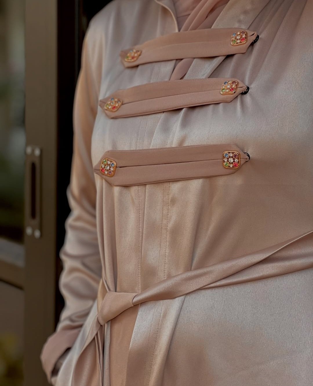 This coat radiates luxury with its lustrous finish and elegant silhouette. Designed with three distinct tabs ,it offers a structured yet flowing look. The coat is further elevated with subtle embellishments, adding a touch of sparkle and sophistication, perfect for making a statement.
