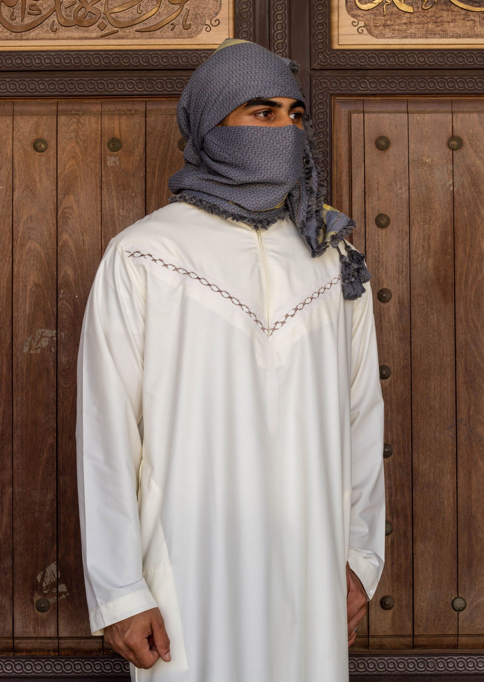 Introducing the Ruhani thobe, where elegance meets symbolism. With a hidden keffiyah print between panels, it honours Palestine’s connection to the mediterranean sea and the resilience of its people.