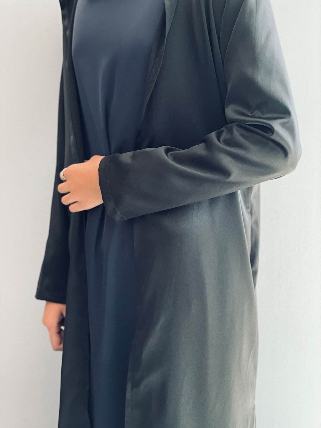 A welcoming silk satin coat that could be paired with an inner dress or jeans for a more casual look.