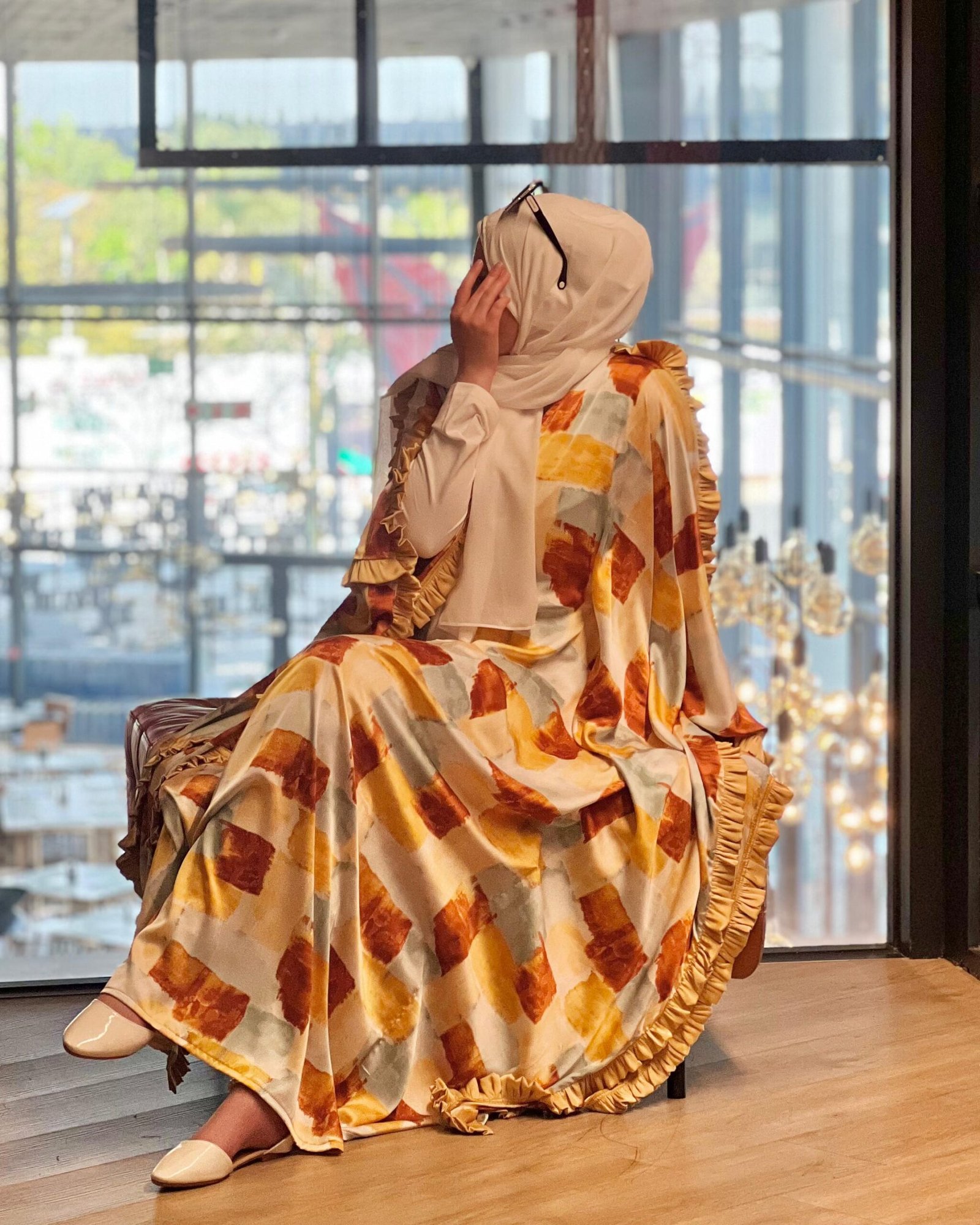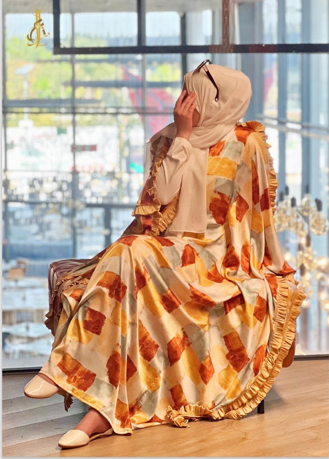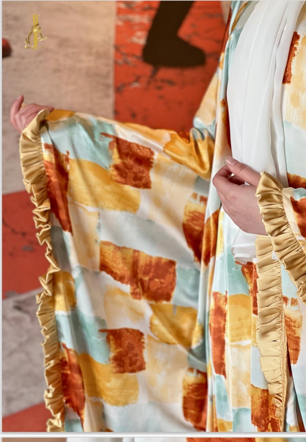 Amber, ochre, and golden brushstrokes sweep across this flowing kaftan, echoing the shifting sands at sunset. Finished with a graceful ruffle trim (optional), it’s a grounded yet radiant expression of desert-inspired elegance.