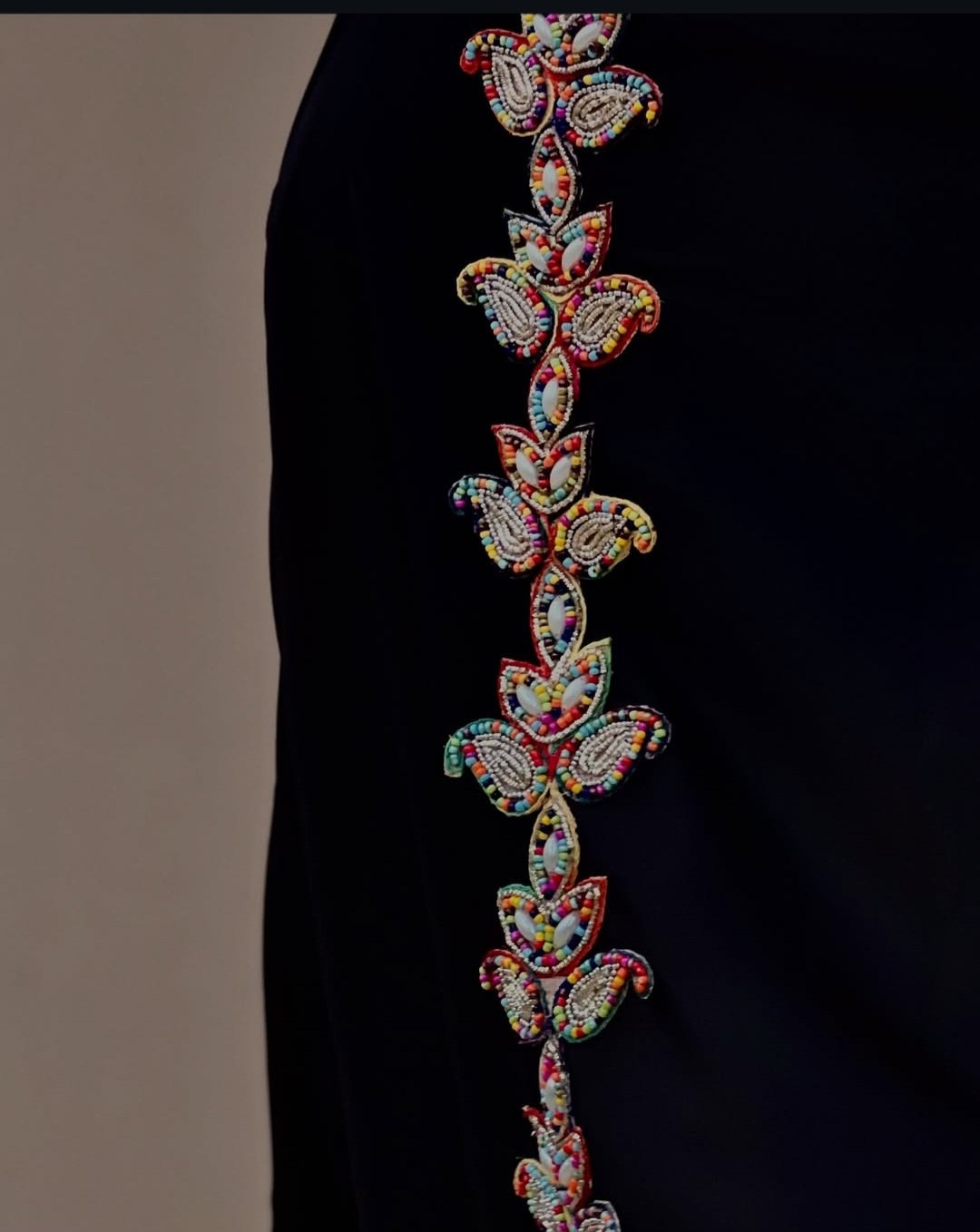 A true statement of elegance, adorned with mesmerizing beadwork cascading down the back in two flawless, parallel lines. The intricate detailing shimmers delicately, with each bead meticulously arranged to form a graceful floral motif. The flowing fabric drapes beautifully, creating an aura of sophistication and timeless charm.