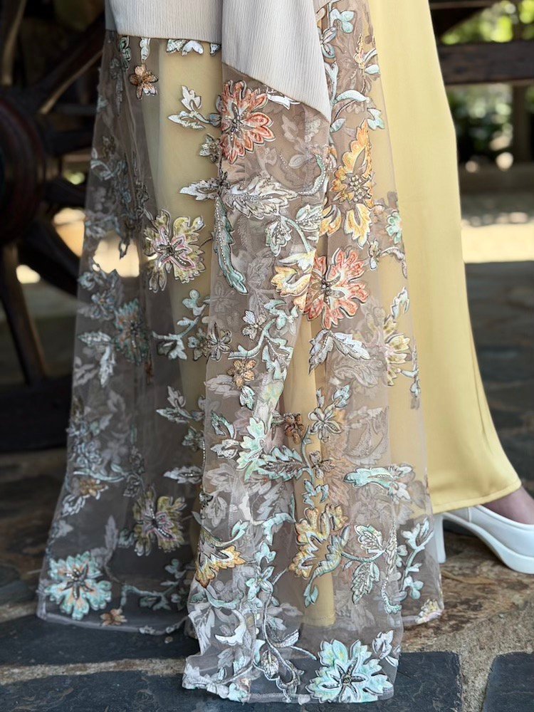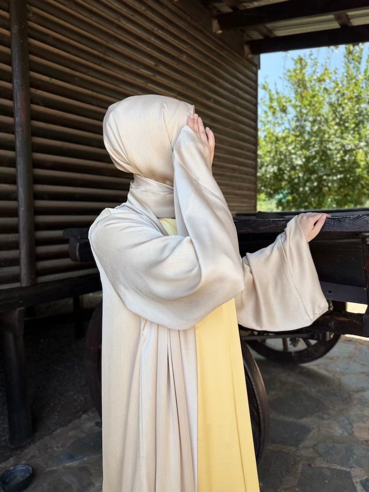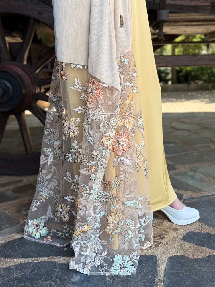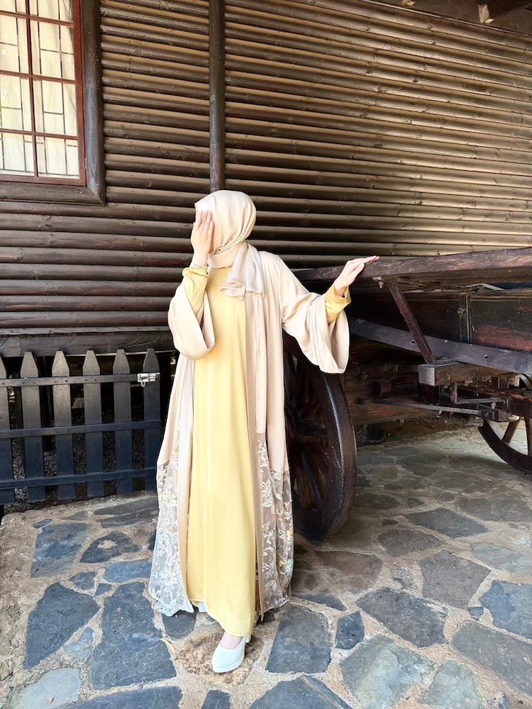 A soft butter-yellow inner dress (available for purchase separately) layered with a sheer lace-panelled open abaya. The outer layer features floral lace embroidery along the hem and lower panels. Light, breathable fabric makes it ideal for daytime Eid wear and spring occasions.