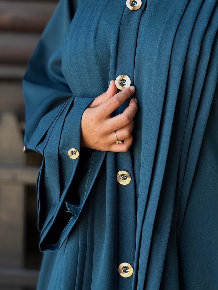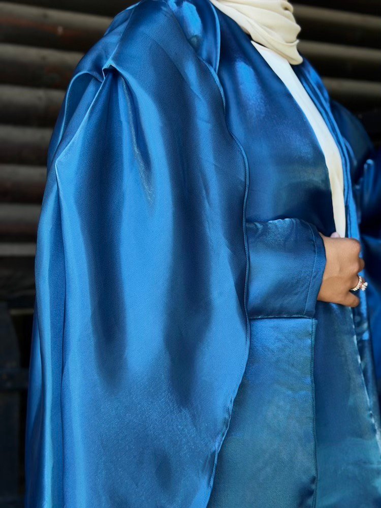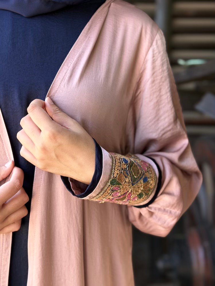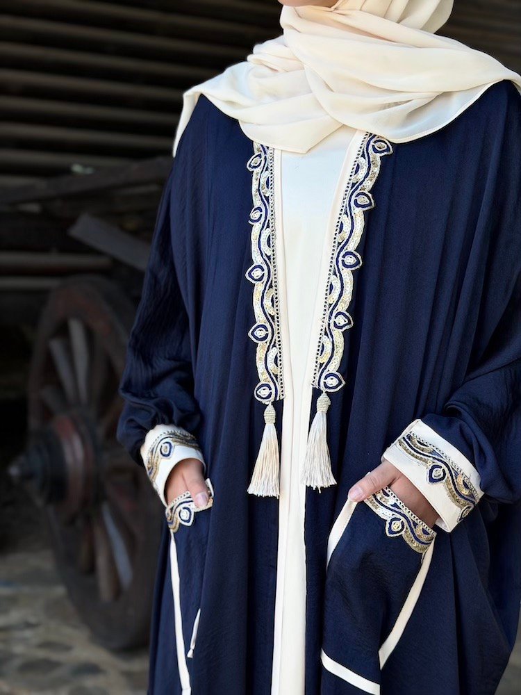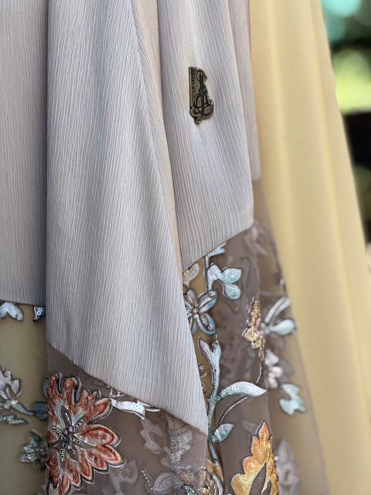 A soft butter-yellow inner dress (available for purchase separately) layered with a sheer lace-panelled open abaya. The outer layer features floral lace embroidery along the hem and lower panels. Light, breathable fabric makes it ideal for daytime Eid wear and spring occasions.