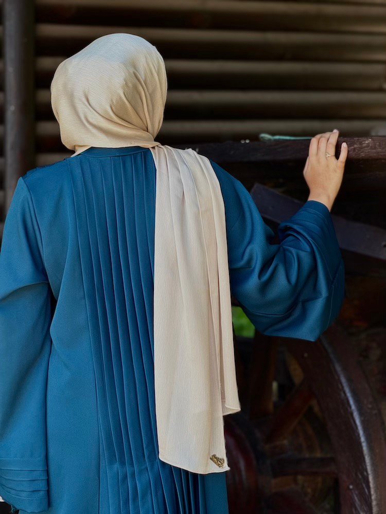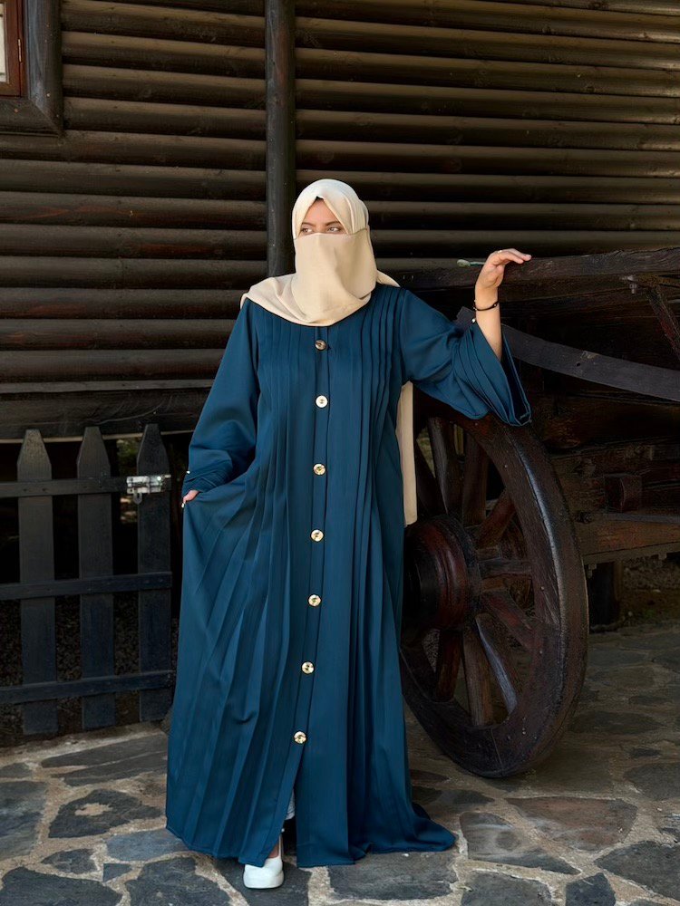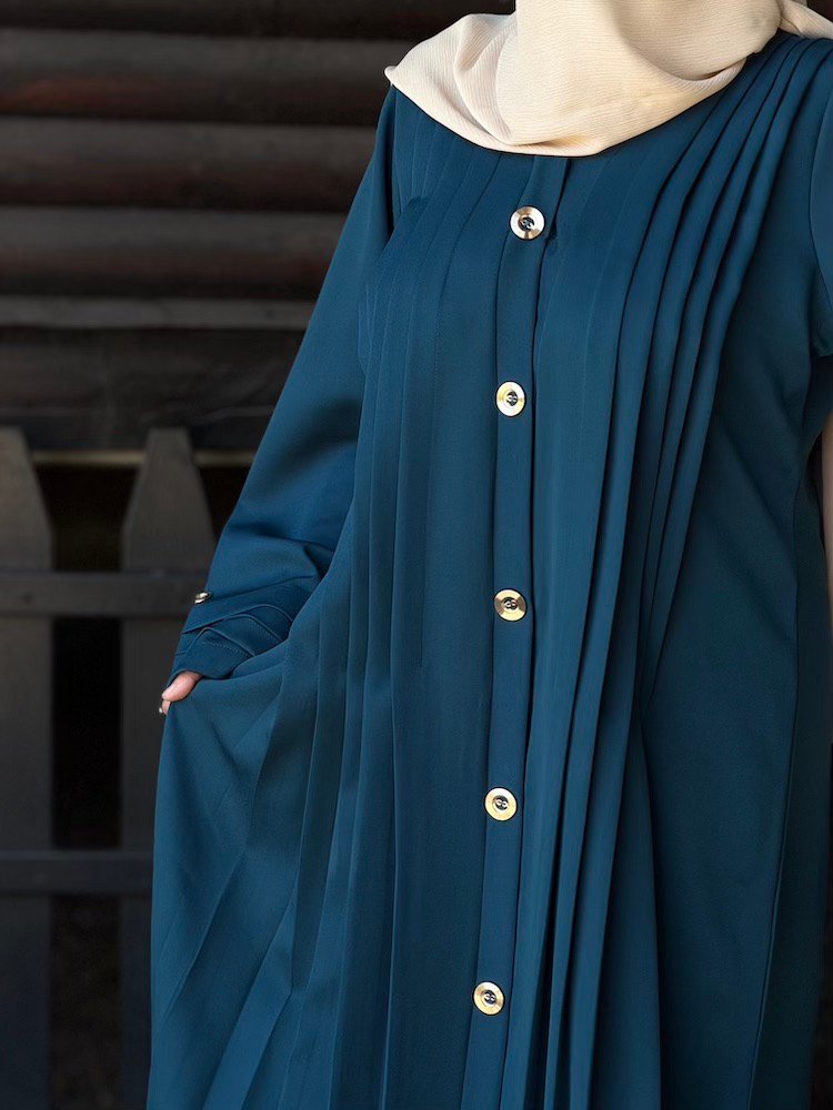 A deep teal abaya featuring structured vertical pleating along the front bodice. Finished with statement gold button detailing from neckline to hem. Sleeves are softly gathered for comfort while maintaining a tailored silhouette. The fabric has a matte luxe finish — balancing structure with softness.