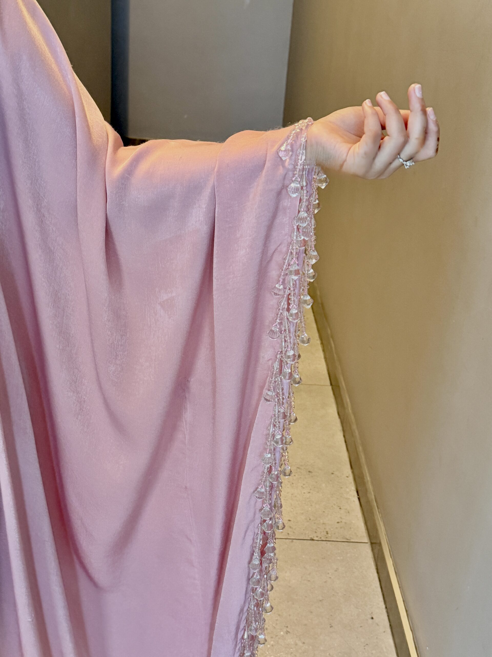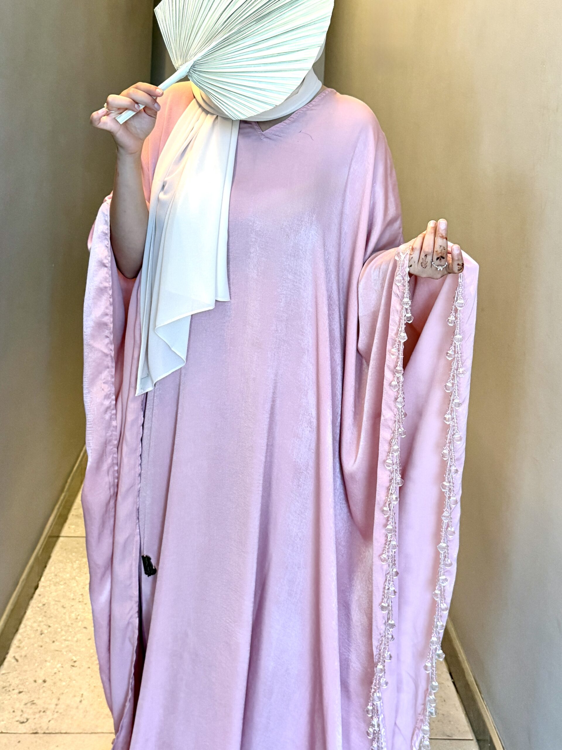 The Haniya Abaya is the definition of soft luxury and graceful femininity. Designed in a delicate pink hue, this kaftan-style silhouette flows effortlessly, creating an elegant and regal presence with every step.