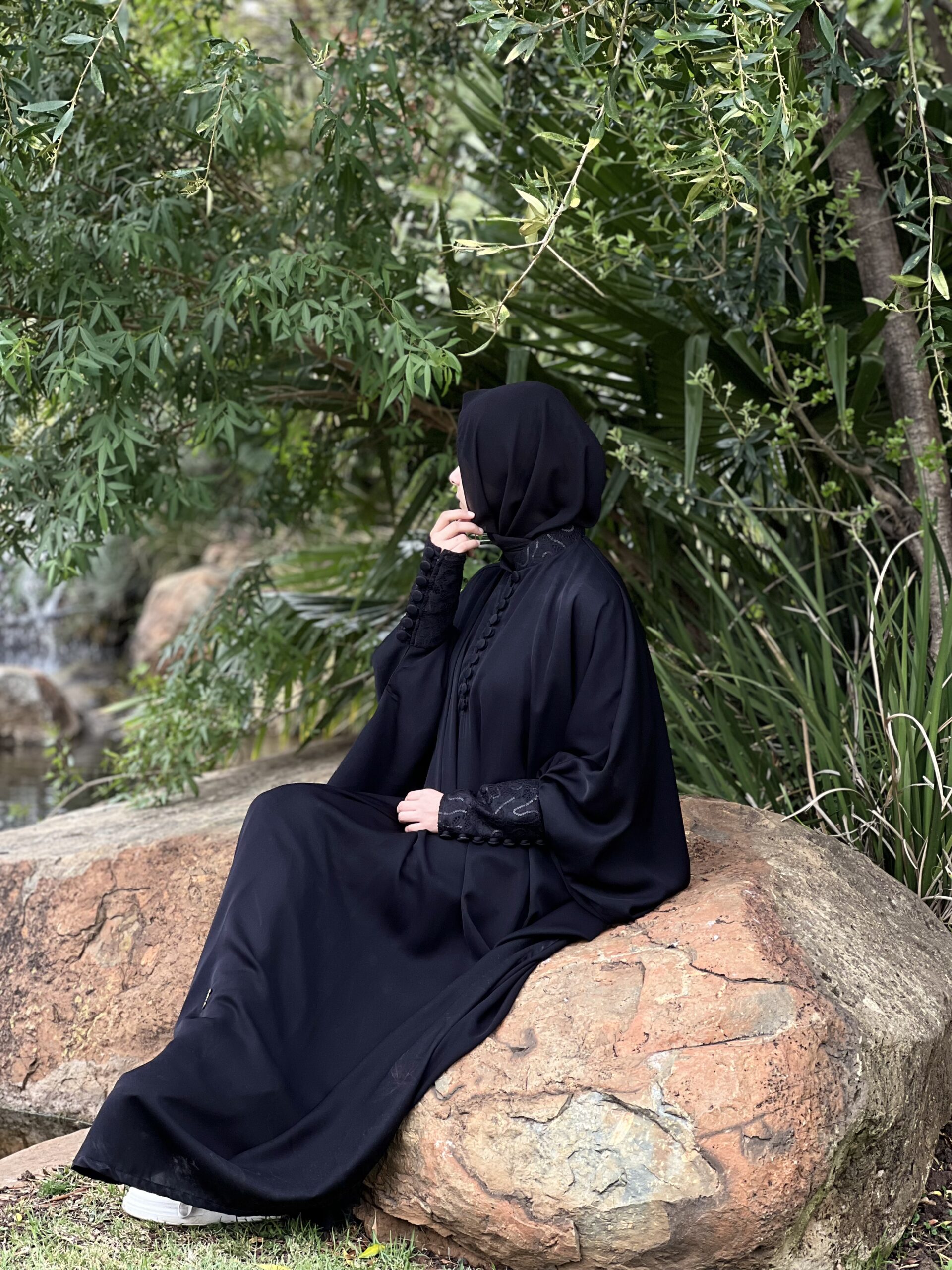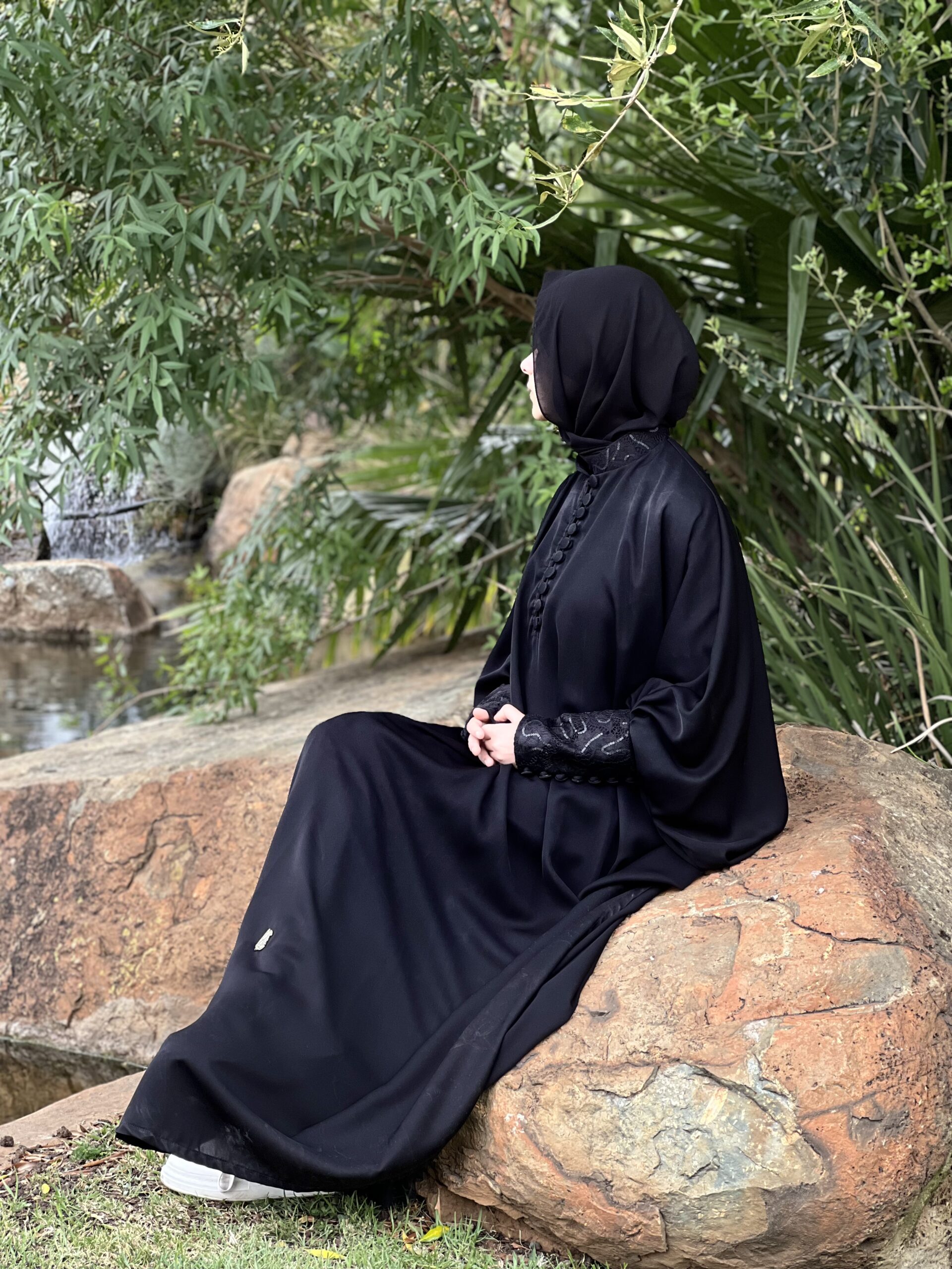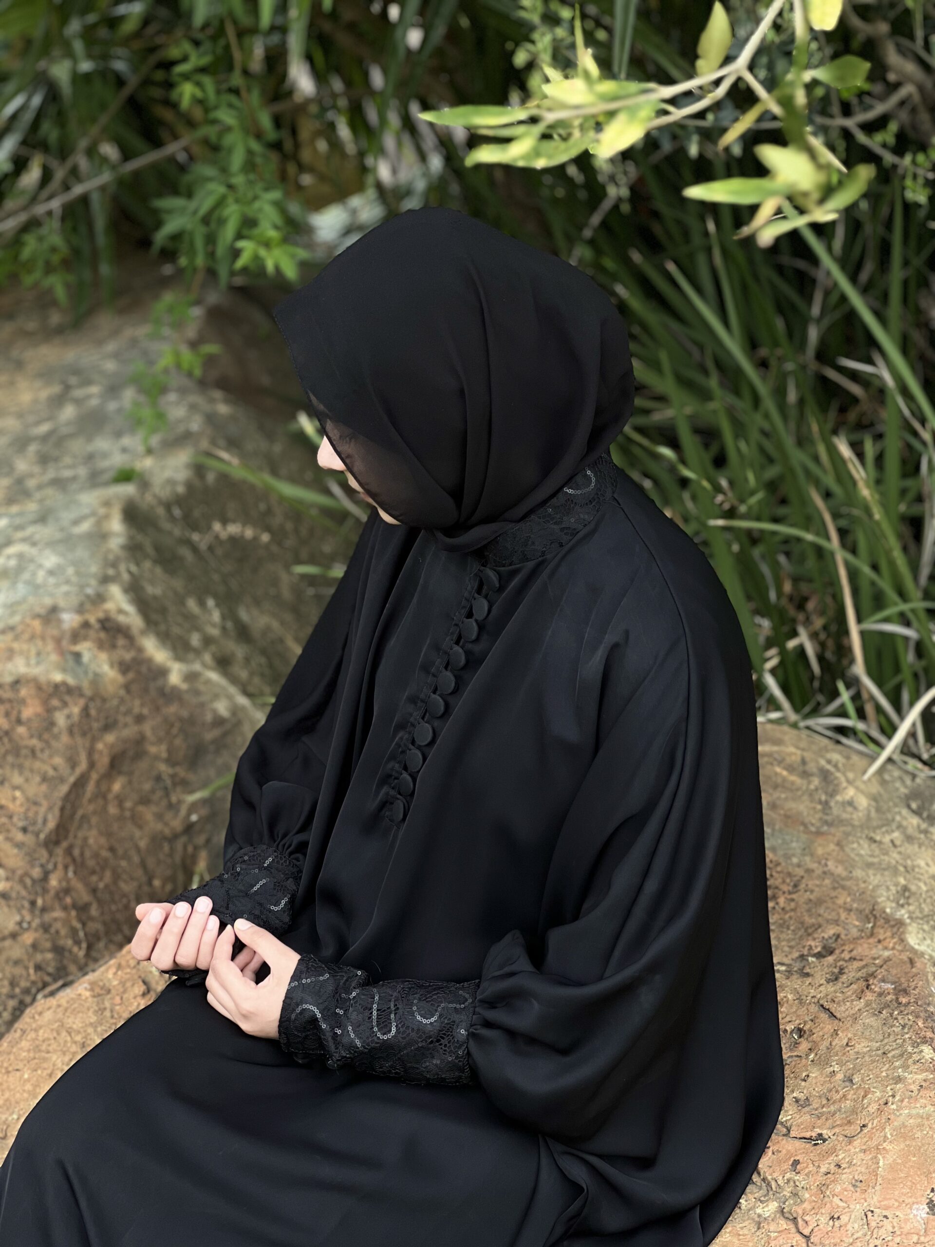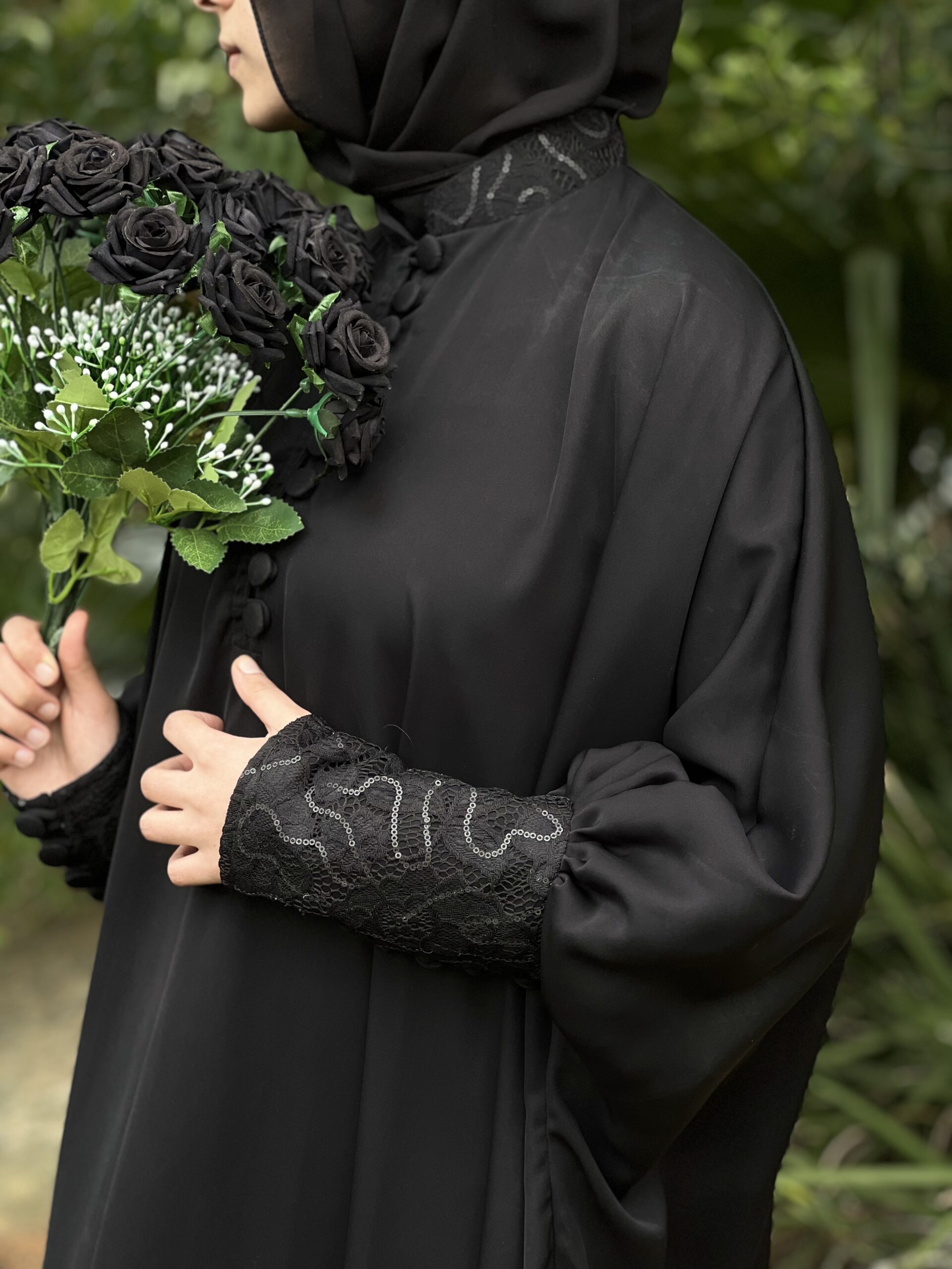 Introducing this stunning abaya, featuring intricate lace detailing on the sleeves and delicate buttons down the chest and sleeves. This timeless piece exudes elegance and sophistication, perfect for any occasion.