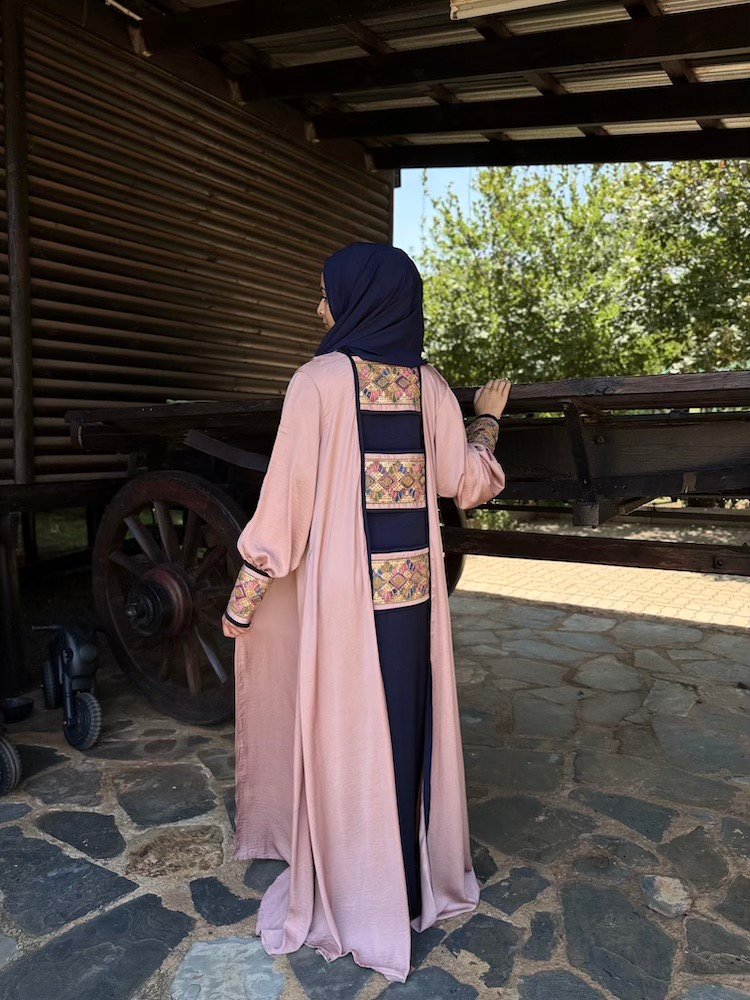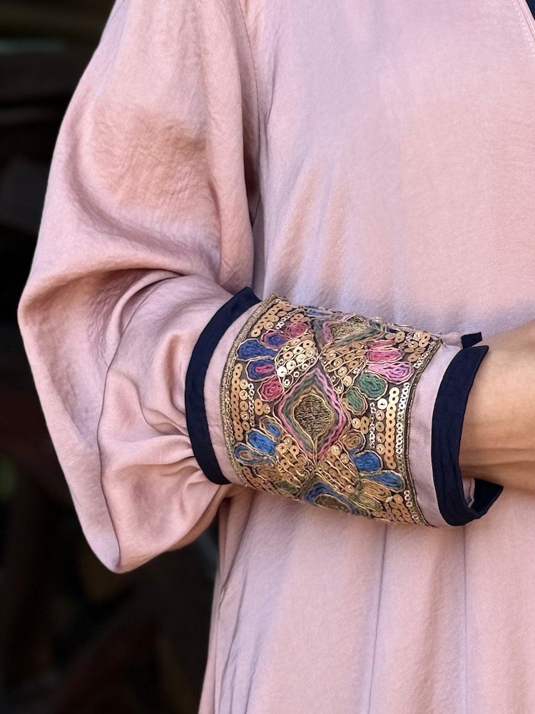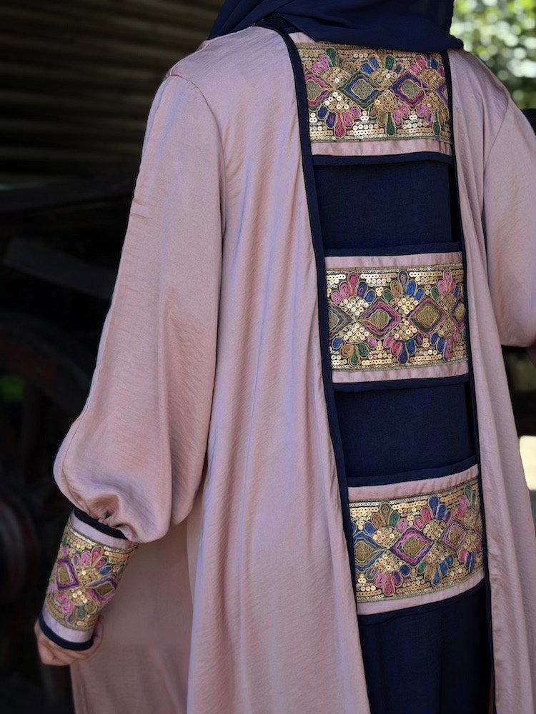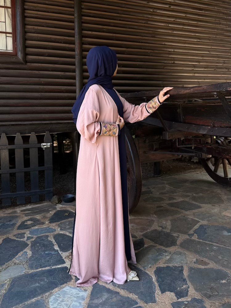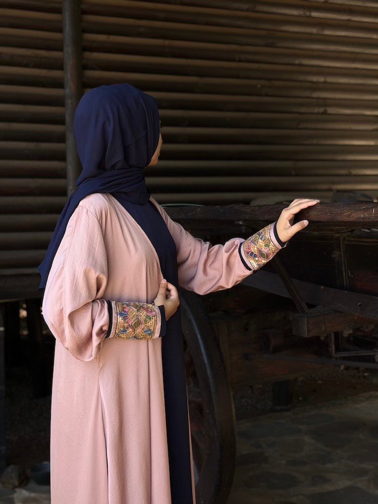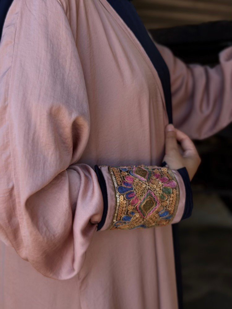 A dusty rose abaya designed with contrasting embroidered cuffs in jewel-tone threadwork. The silhouette is clean and straight-cut, allowing the sleeve detailing to stand out. Crafted from a lightweight fabric suitable for everyday elegance.
