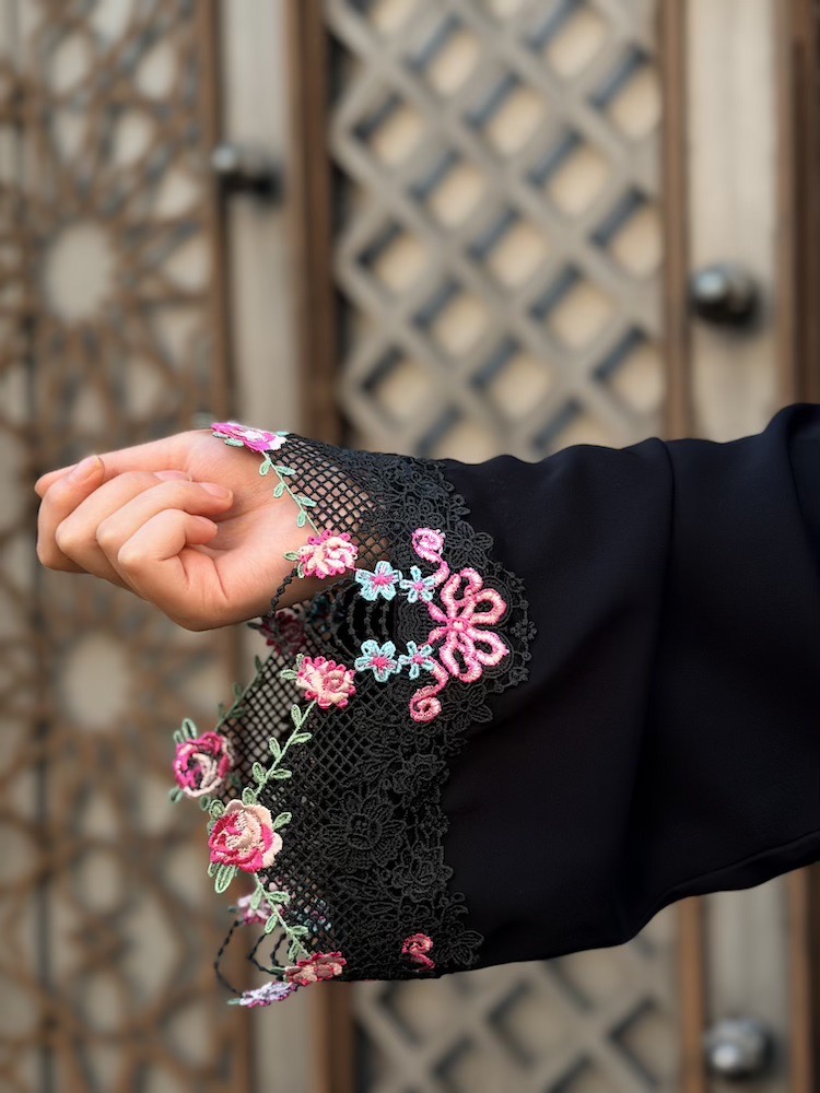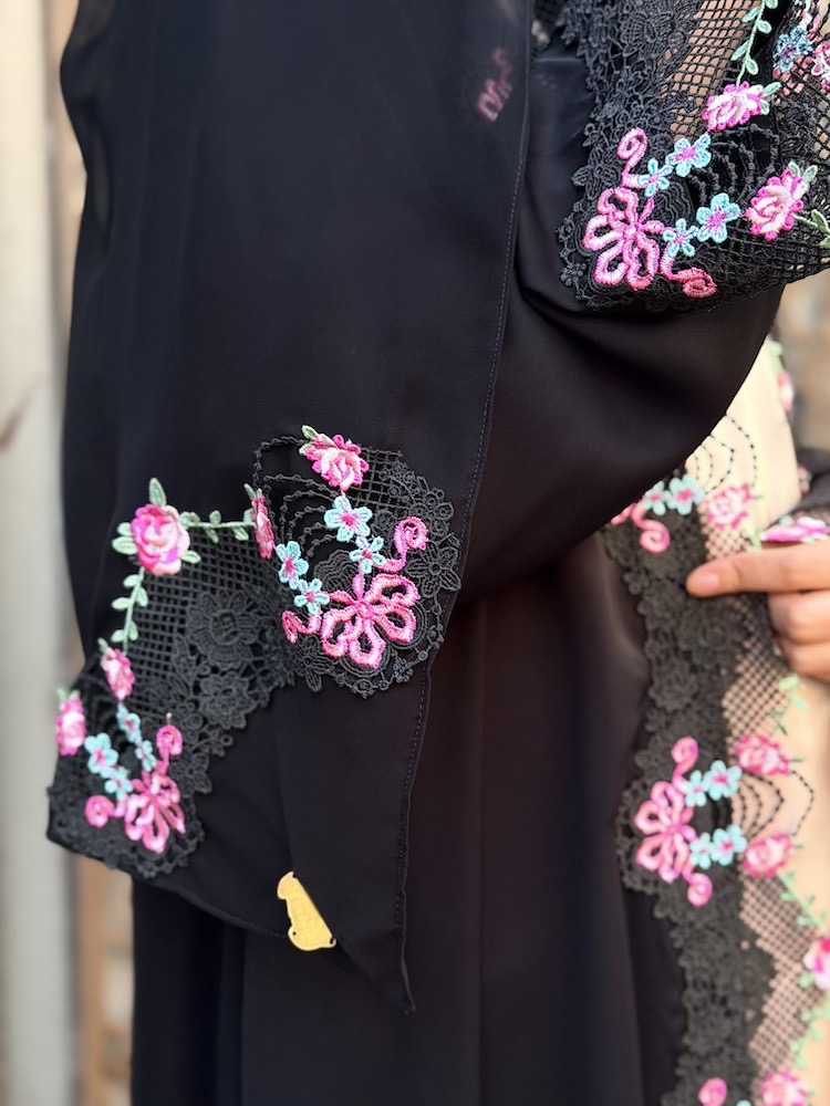Front-open design adorned with intricate floral lacework balancing delicacy with structure through its clean line.
